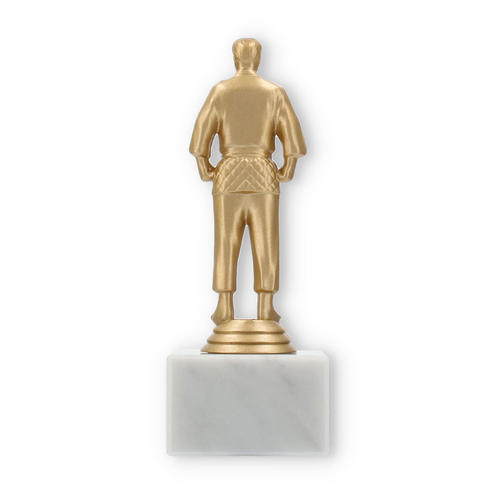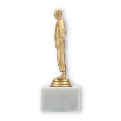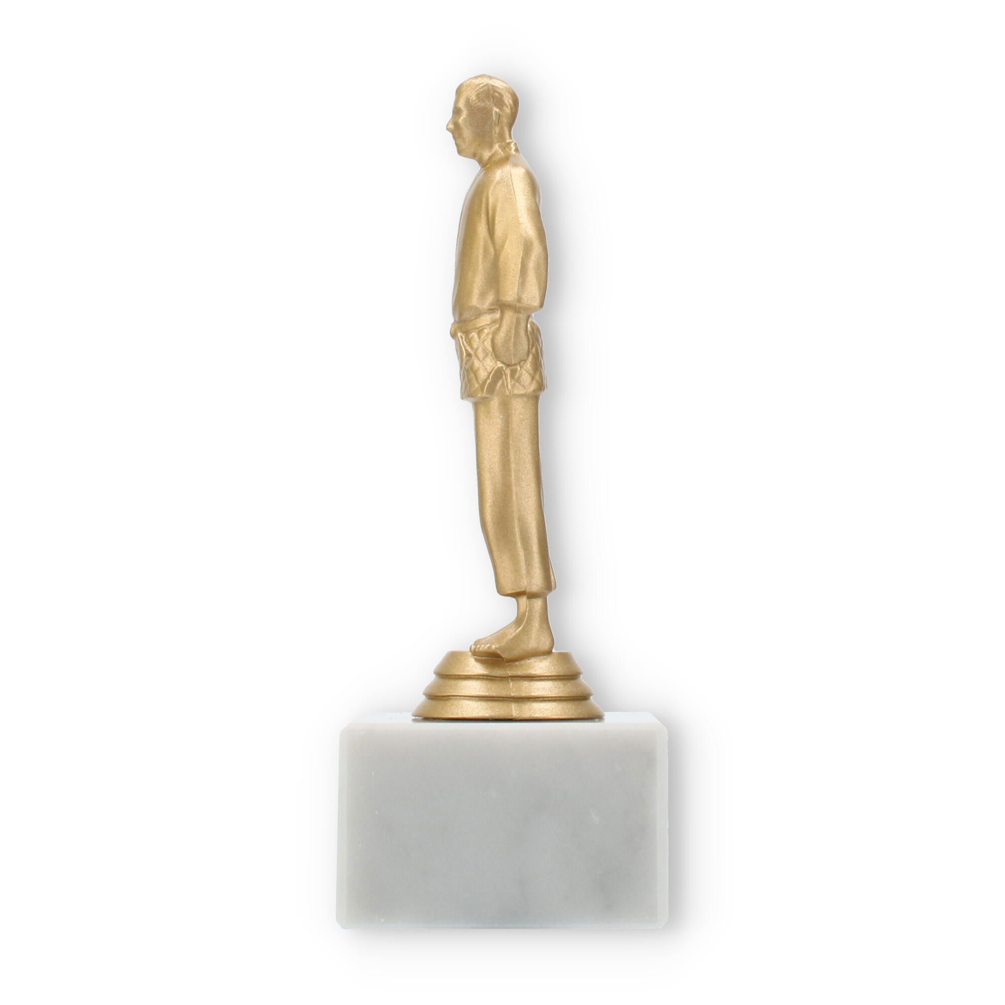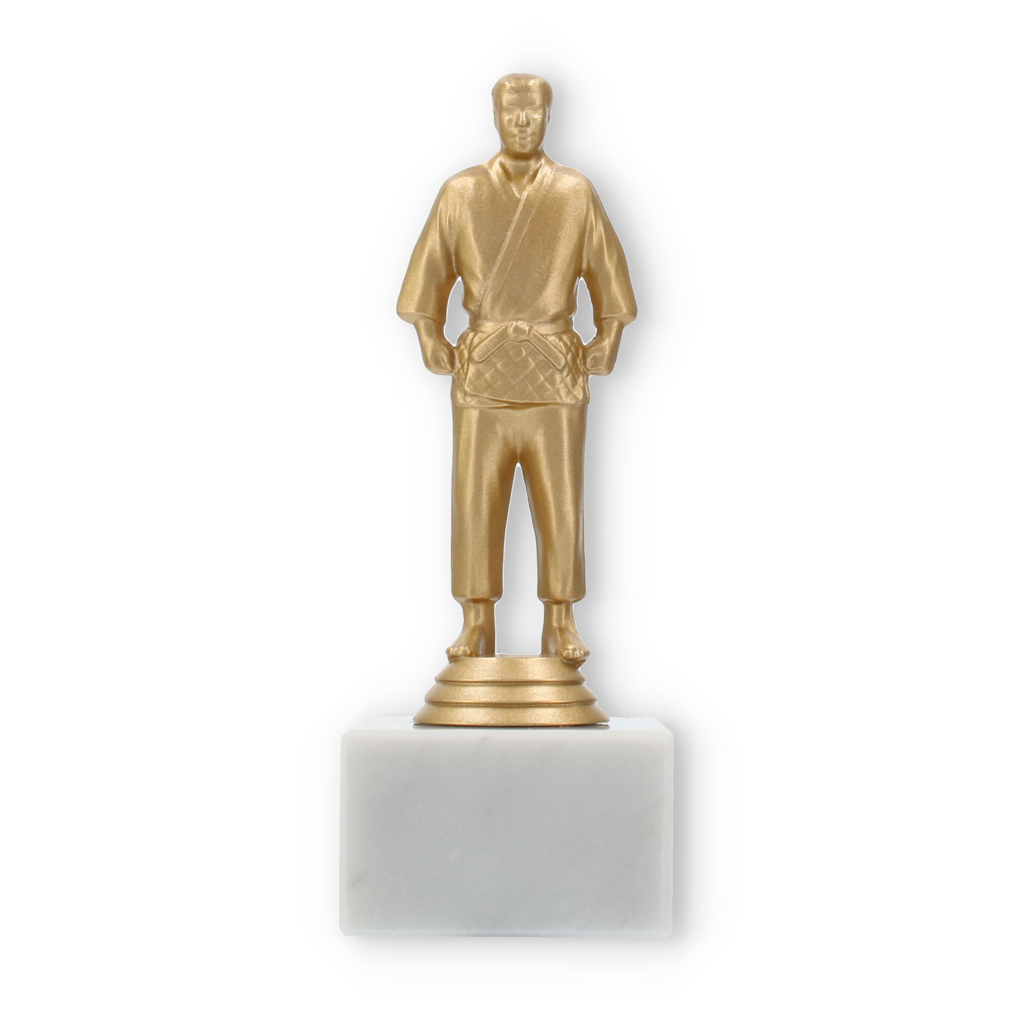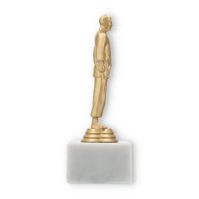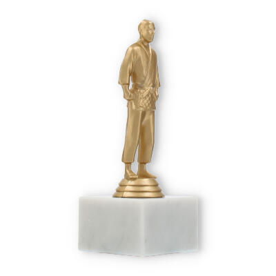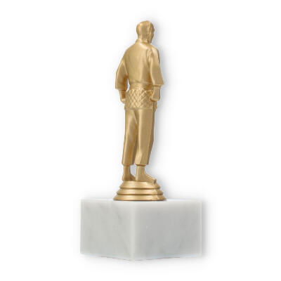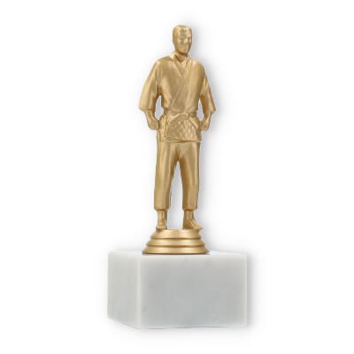 Oto trofeum, które idealnie oddaje ducha rywalizacji w sportach walki. Figurka Judo prezentuje dynamiczną sylwetkę zawodnika, której złoty metaliczny kolor nadaje głębi i znaczenia. To dzieło sztuki stoi na białej marmurowej podstawie, dodając całości subtelnej elegancji.