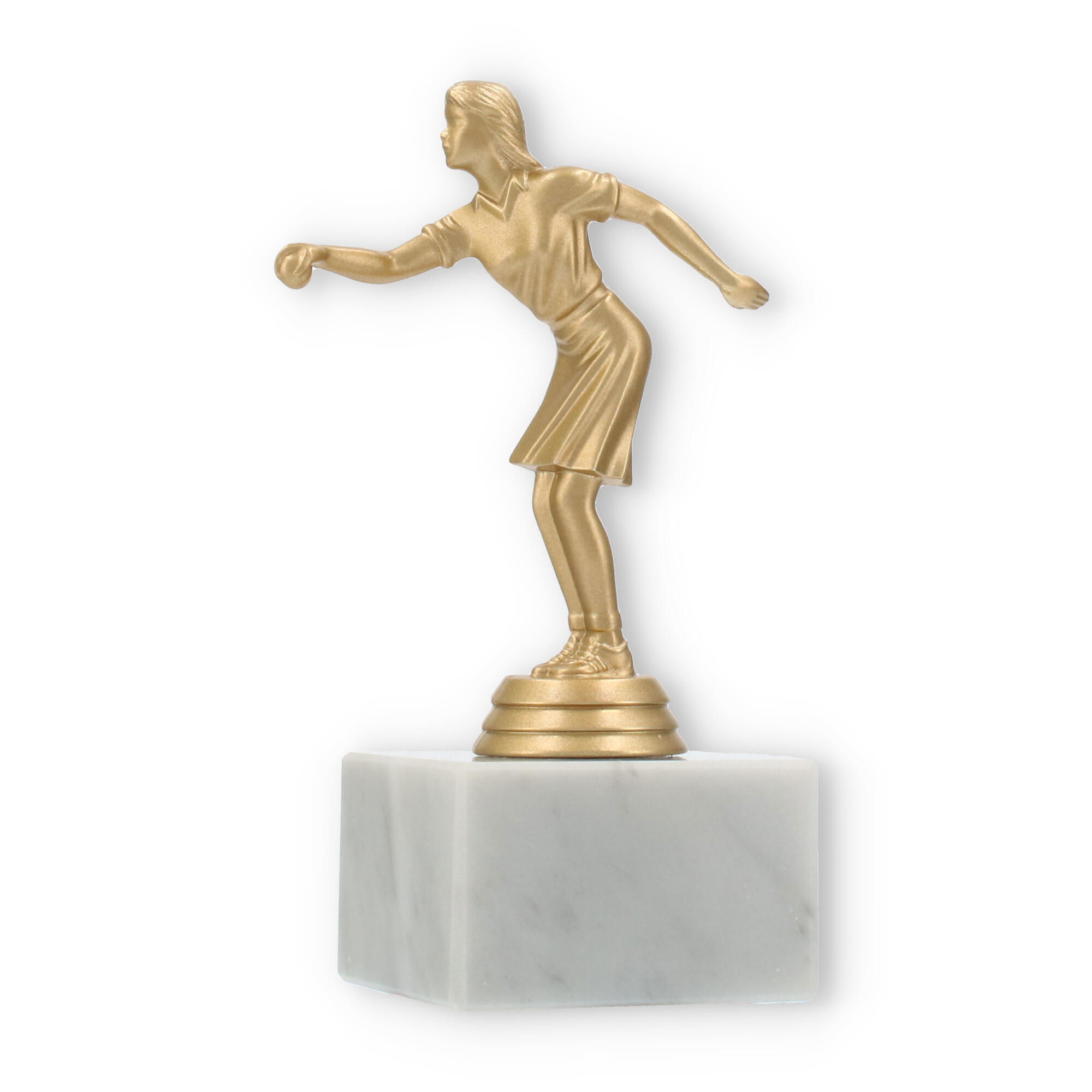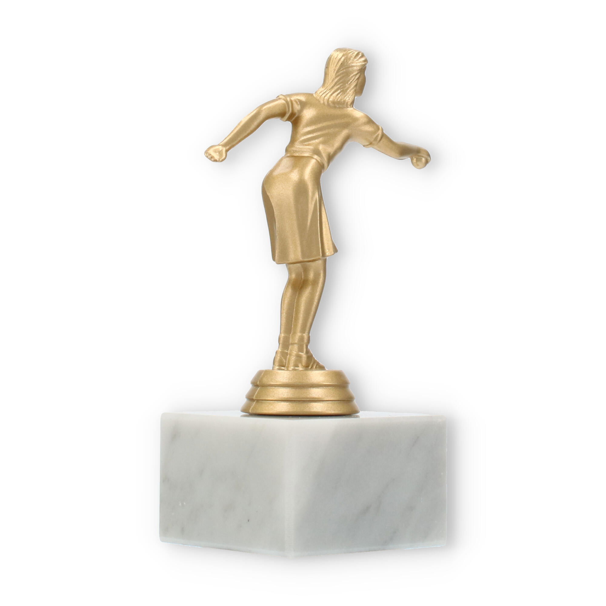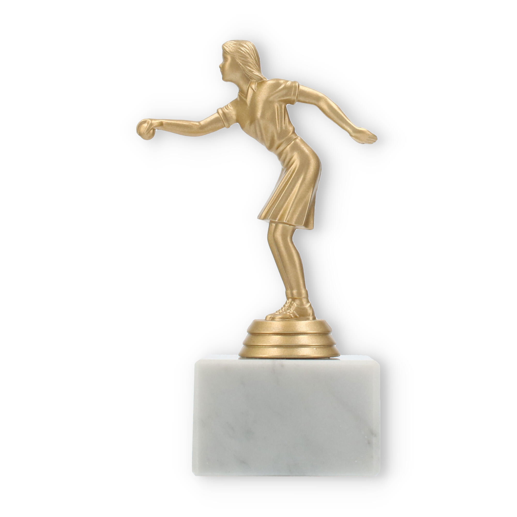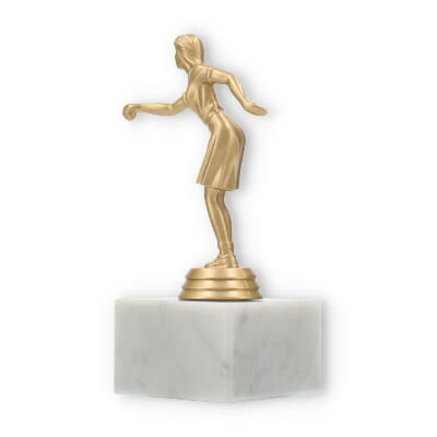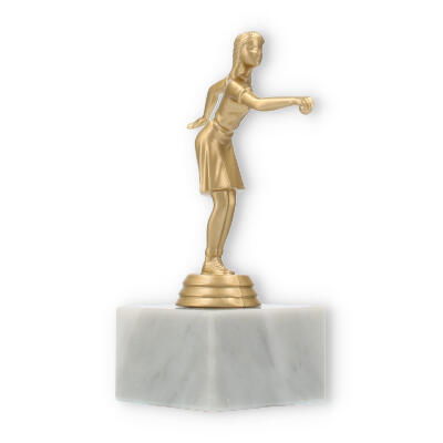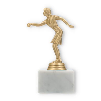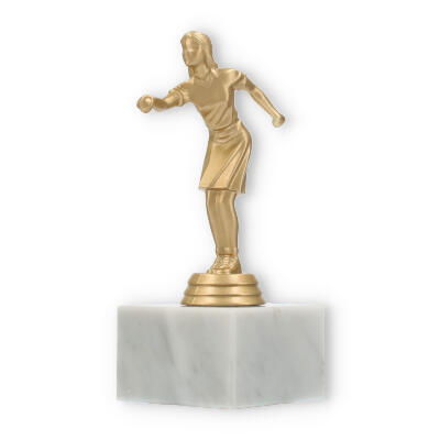 La figurine de trophée Pétanque Dames de 15,5 cm, avec sa finition dorée et son socle en marbre blanc, idéalement conçue pour honorer les championnes de pétanque. Personnalisable avec une gravure, elle immortalise les performances exceptionnelles.