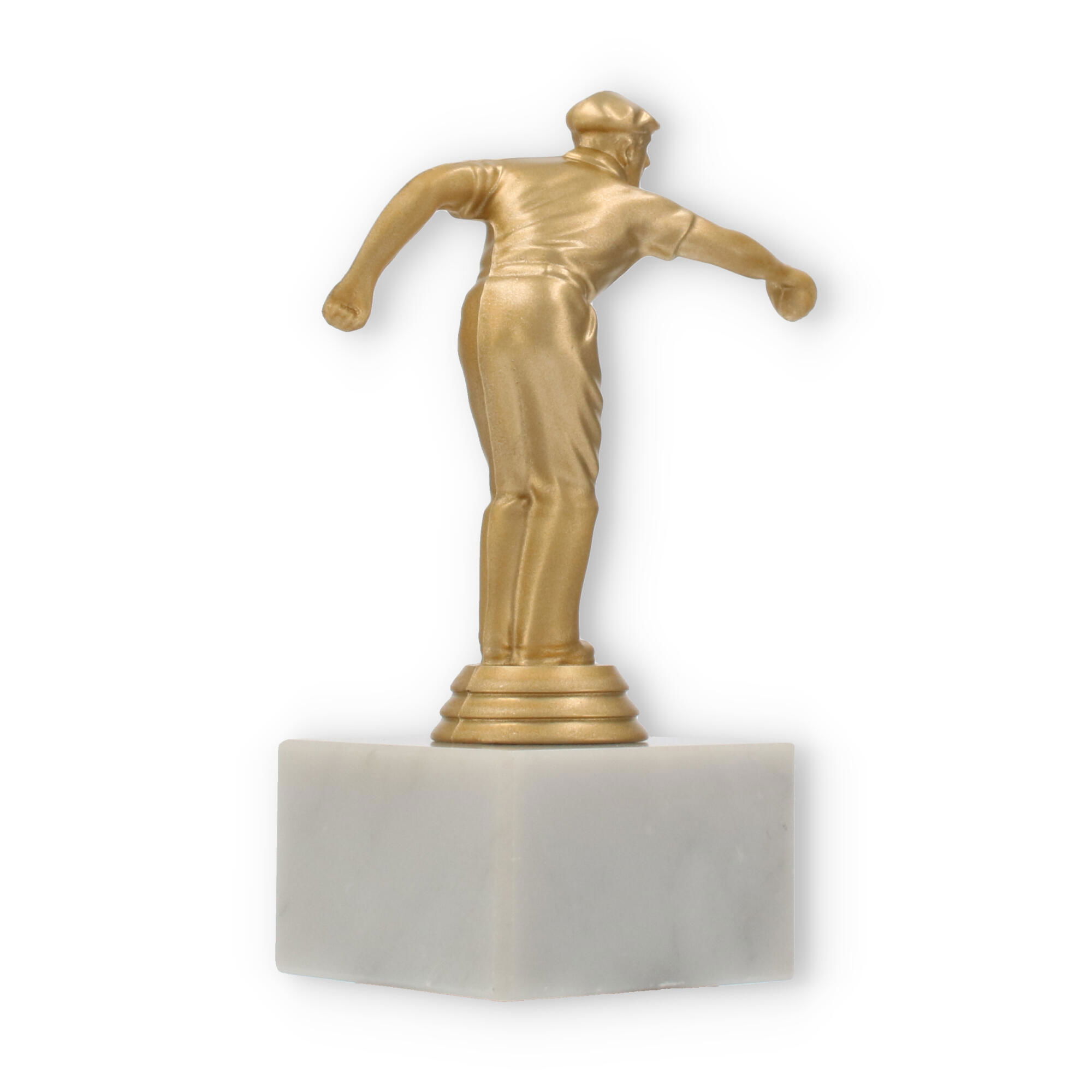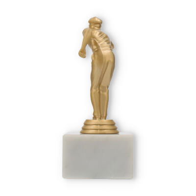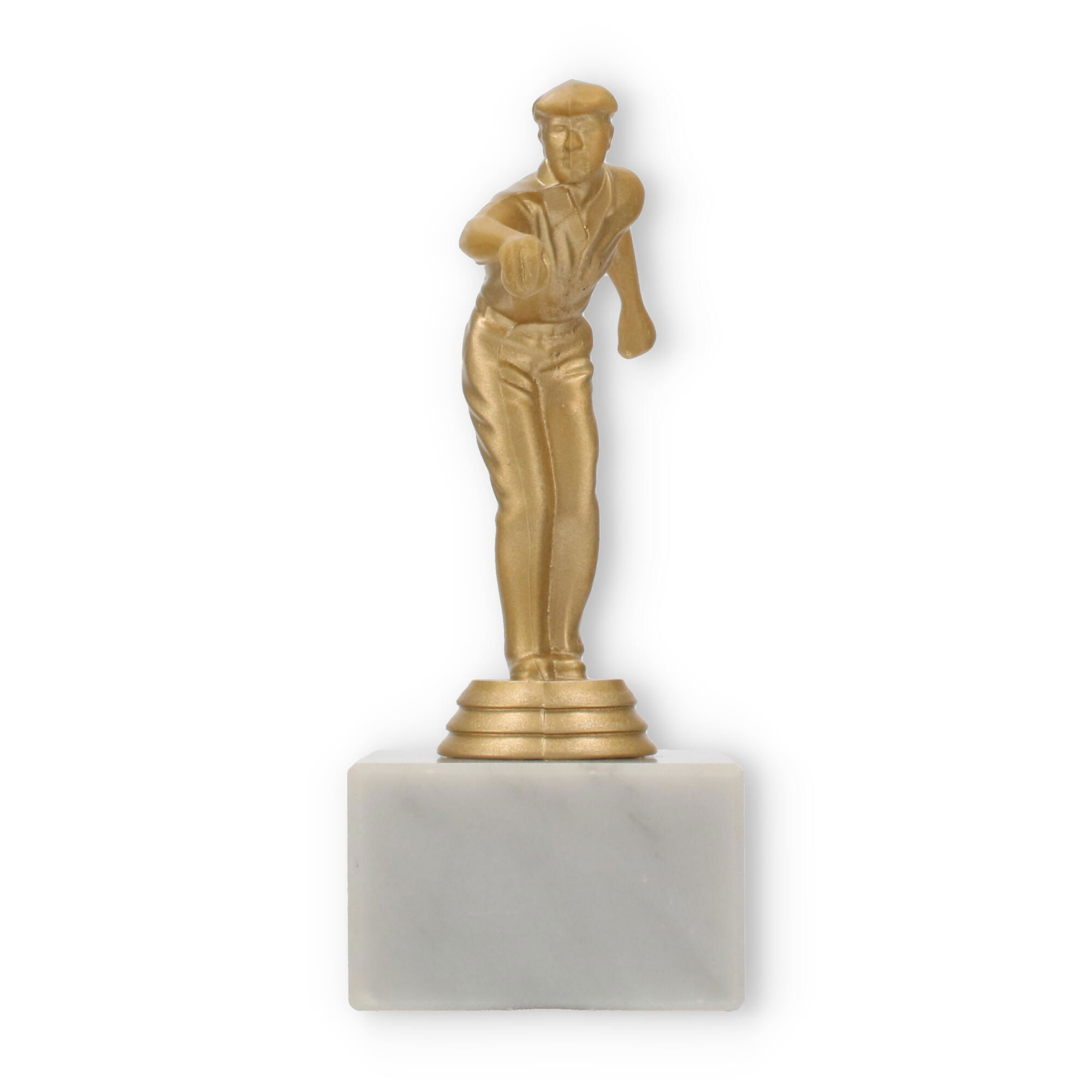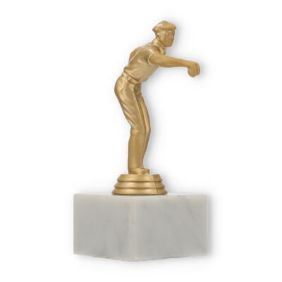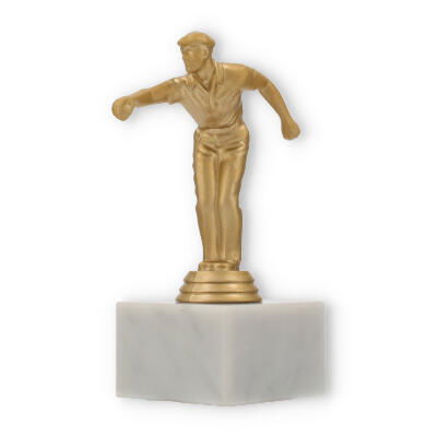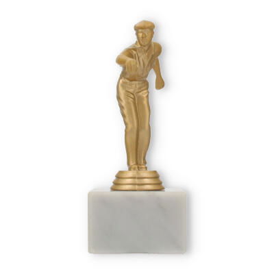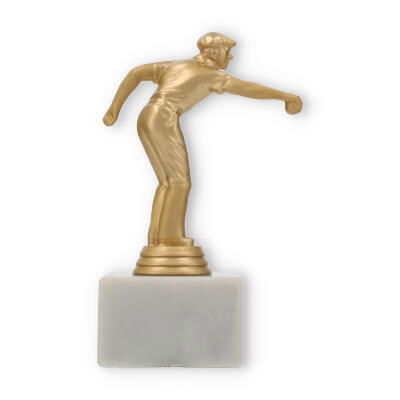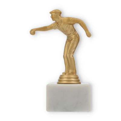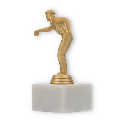The Trophy Petanque Men is a distinctive award that captures the excitement of any Petanque tournament. Designed with a gold-colored plastic figure in a dynamic throwing pose and mounted on a sleek white marble base, it embodies both stability and elegance.