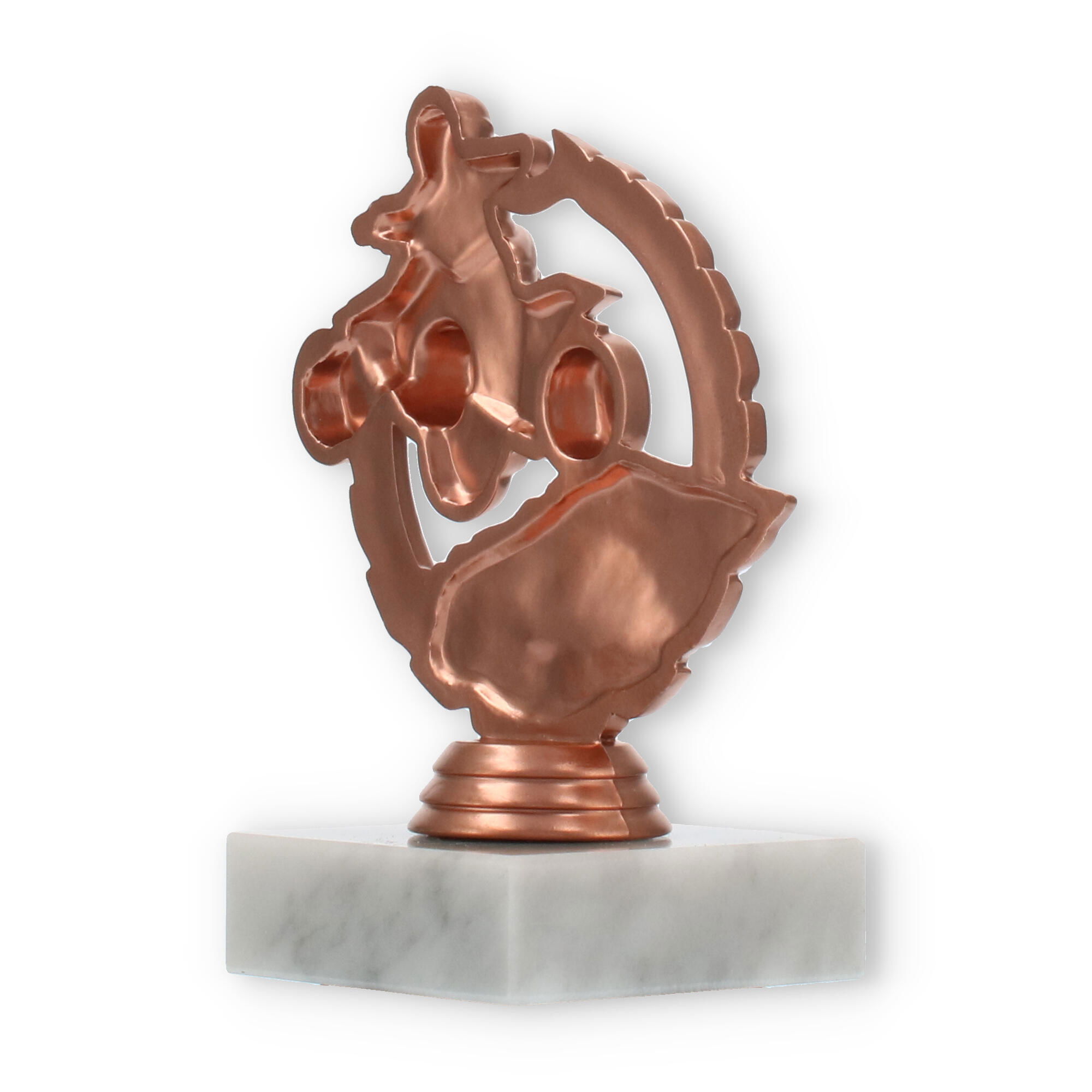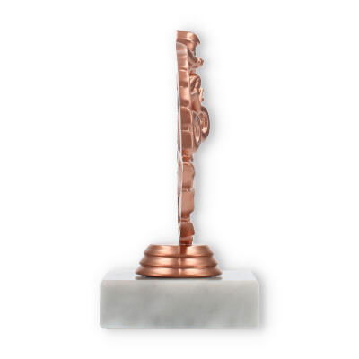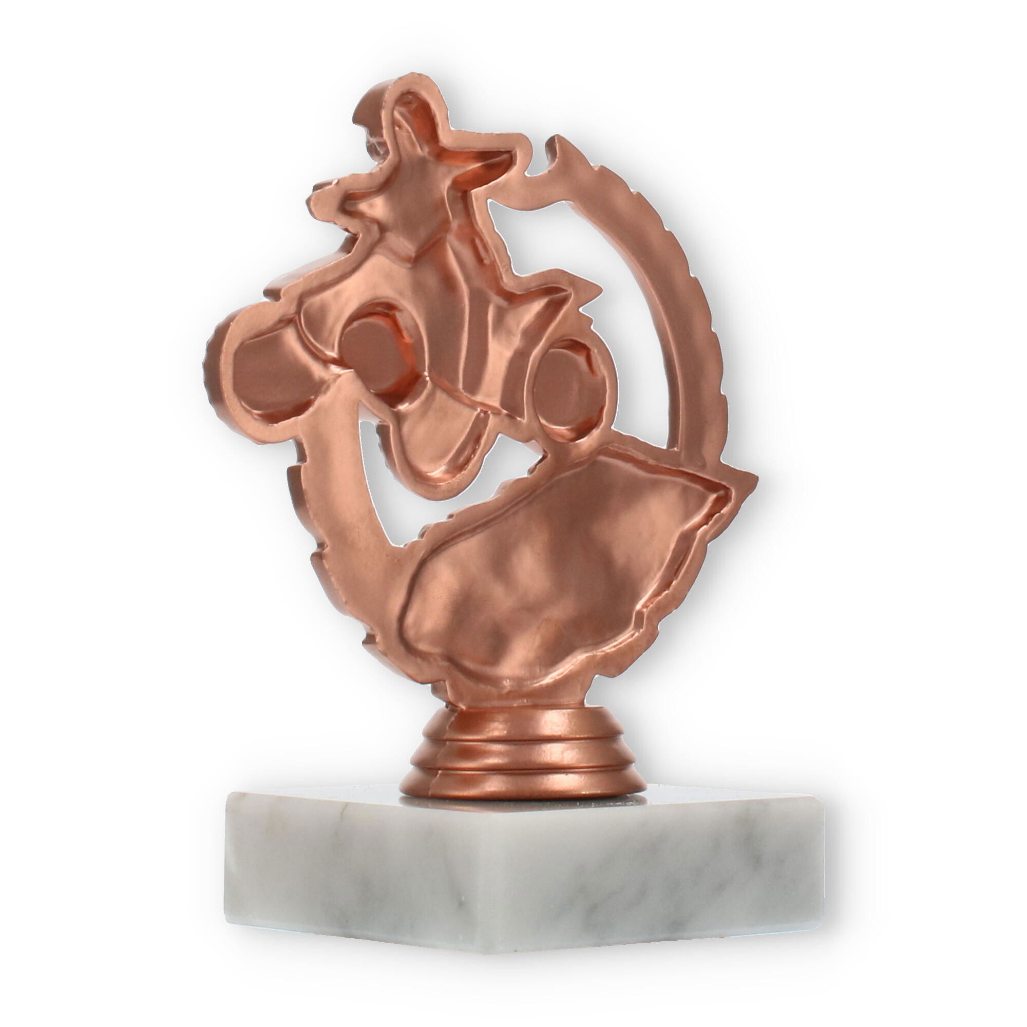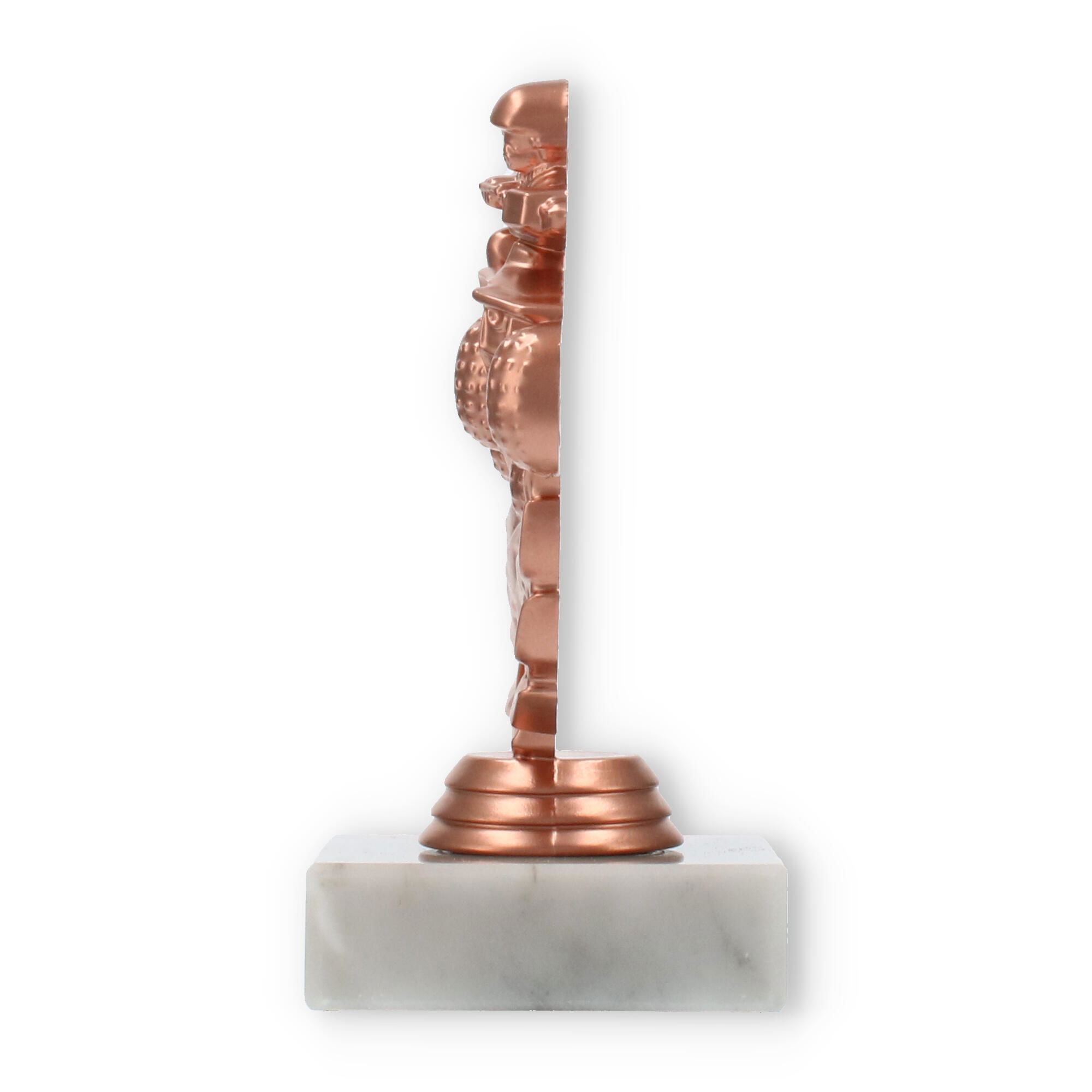 Der hochwertige Sockel aus Marmor in einem dezenten Weißton verleiht dem Pokal eine robuste Basis und fügt seiner Optik eine zusätzliche Eleganz hinzu. Die Kombination aus der bronzefarbenen Figur und dem hellen Marmorsockel schafft einen ansprechenden Kontrast, der jede Trophäenvitrine bereichert.