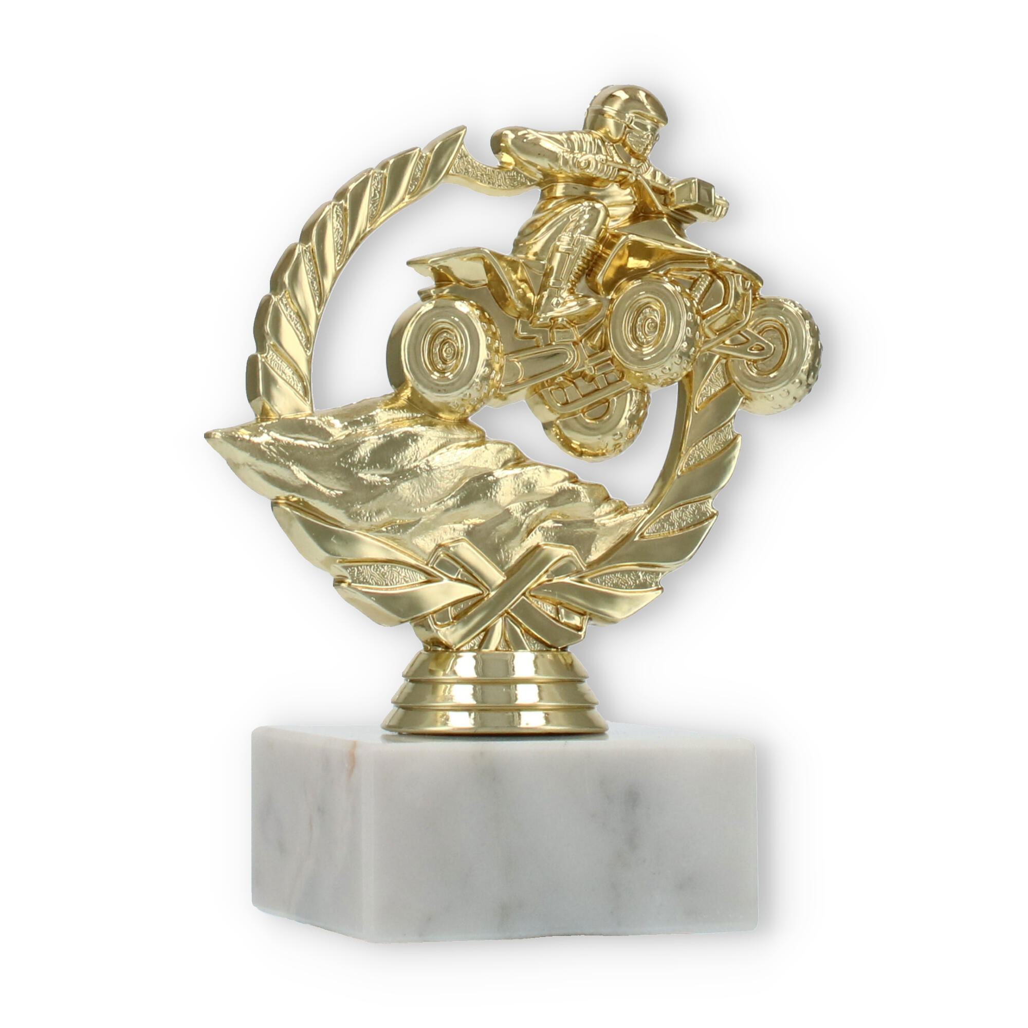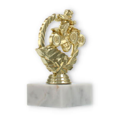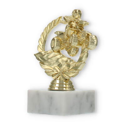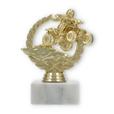Die Pokalfigur Quad im Kranz bietet eine einzigartige Möglichkeit, sportliche Höchstleistungen zu würdigen. Gefertigt aus goldfarbenem Kunststoff, besticht sie mit detaillierten Elementen wie dem Quadfahrer und dem Lorbeerkranz. Der weiße Marmorsockel ist poliert und verleiht der Trophäe einen eleganten Touch.