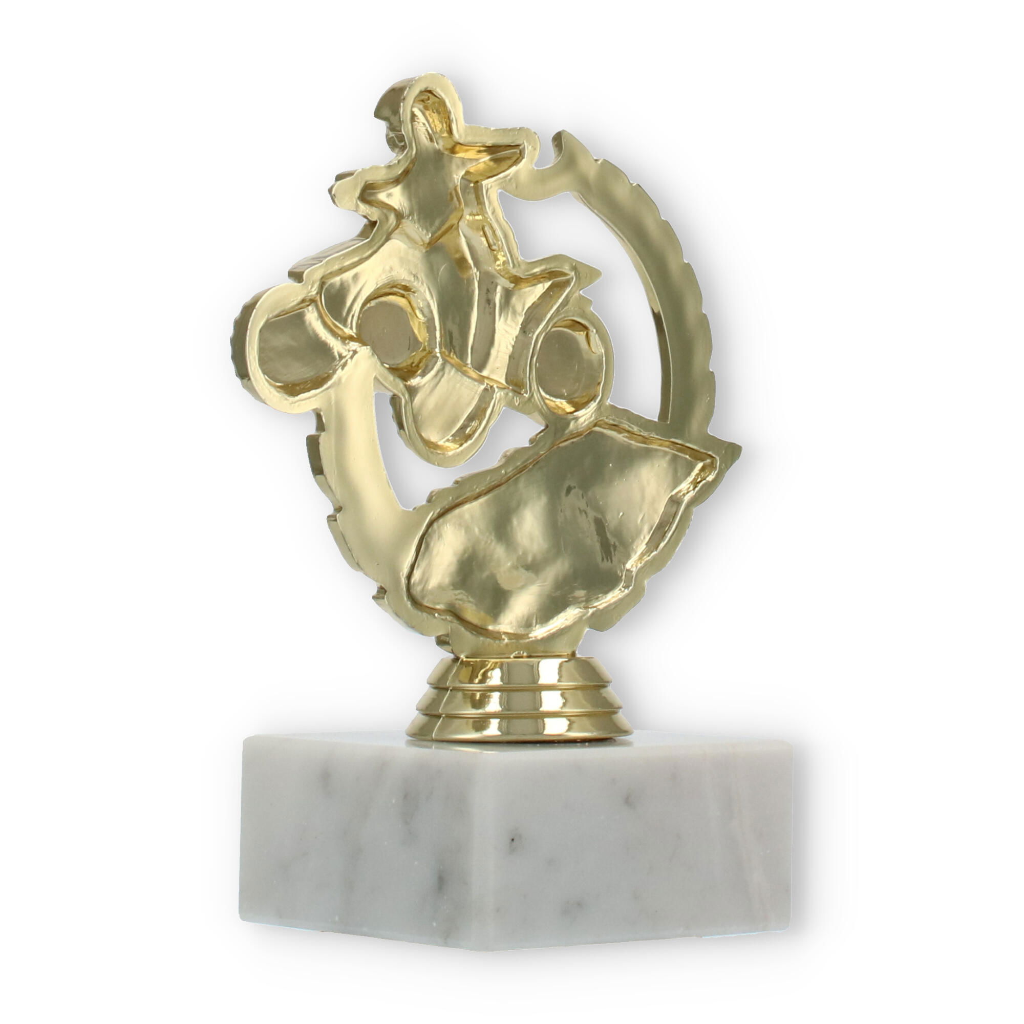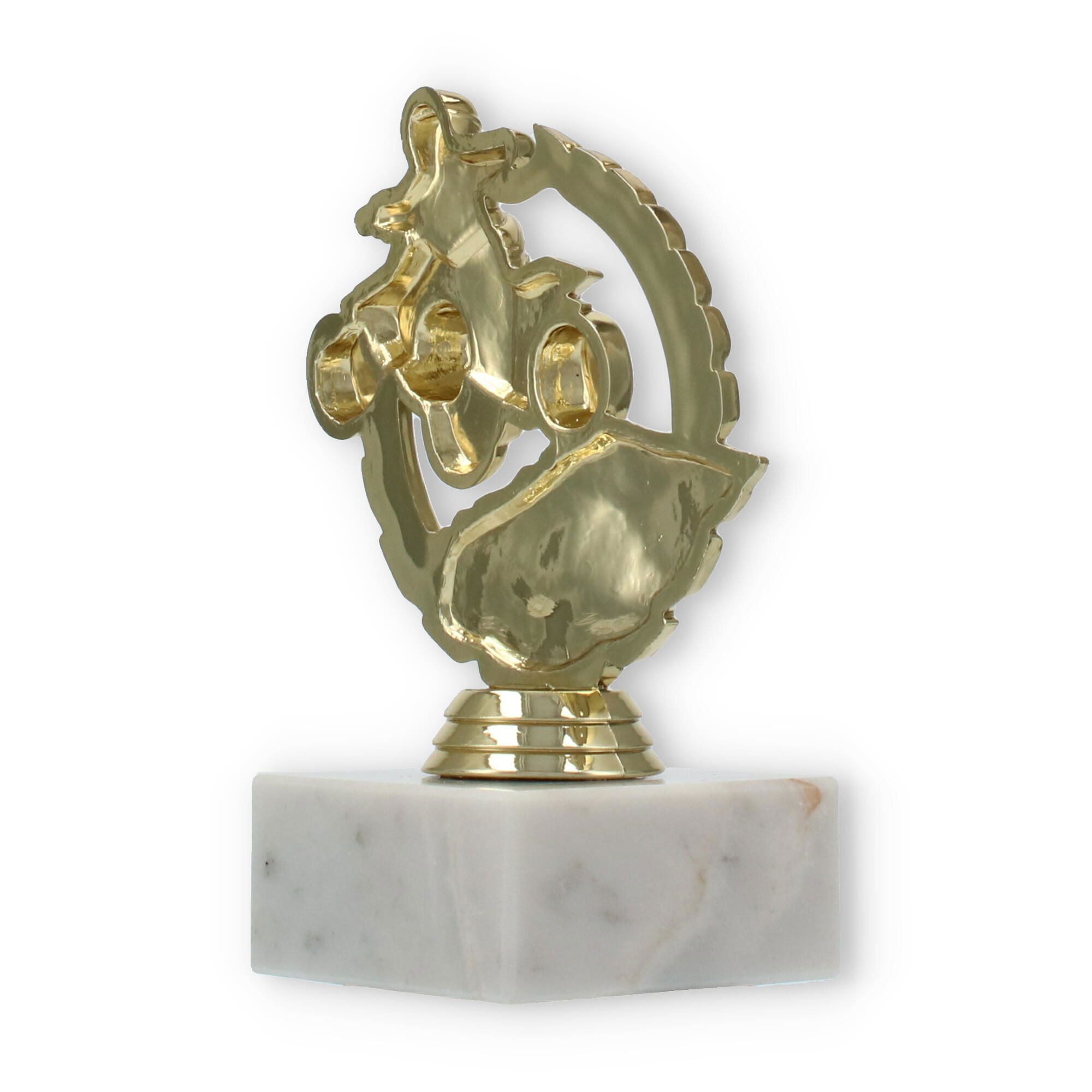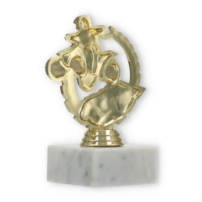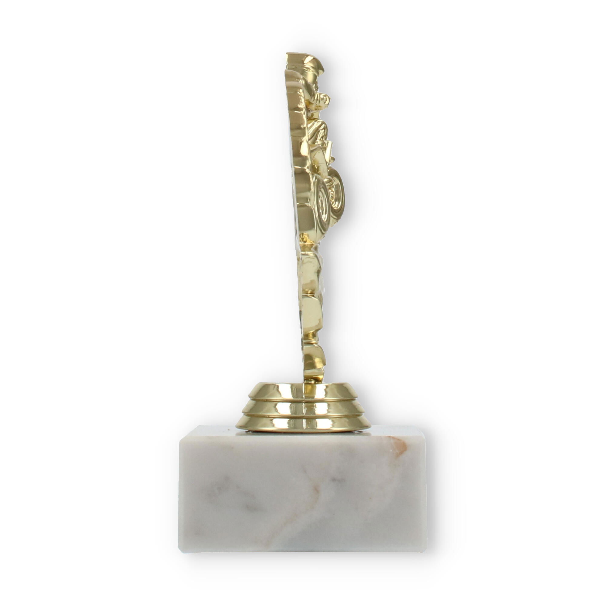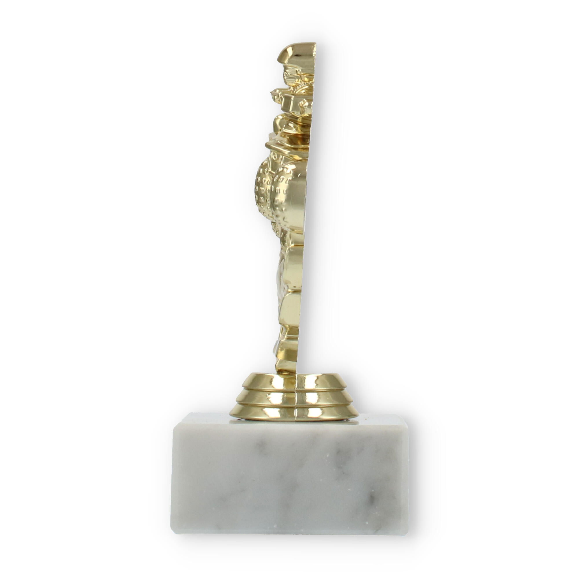 Mit einer Höhe von 13,6 cm und einem optimalen Gewicht von 347 g liegt diese Pokalfigur hervorragend in der Hand und fühlt sich wertig an. Der Sockel aus hochwertigem weißem Marmor steht in starkem Kontrast zur goldfarbenen Figur, was der Trophäe eine besondere optische Tiefe verleiht.