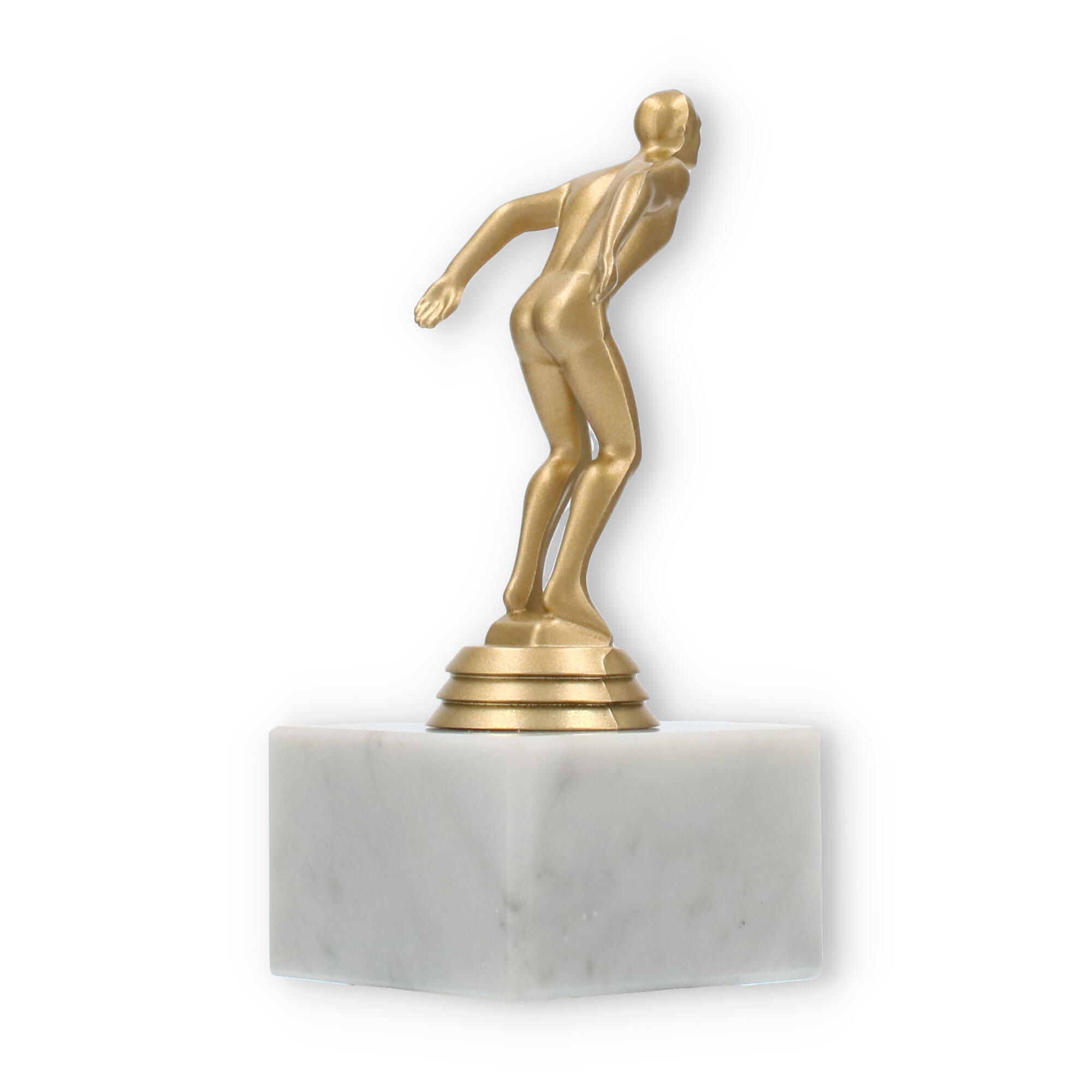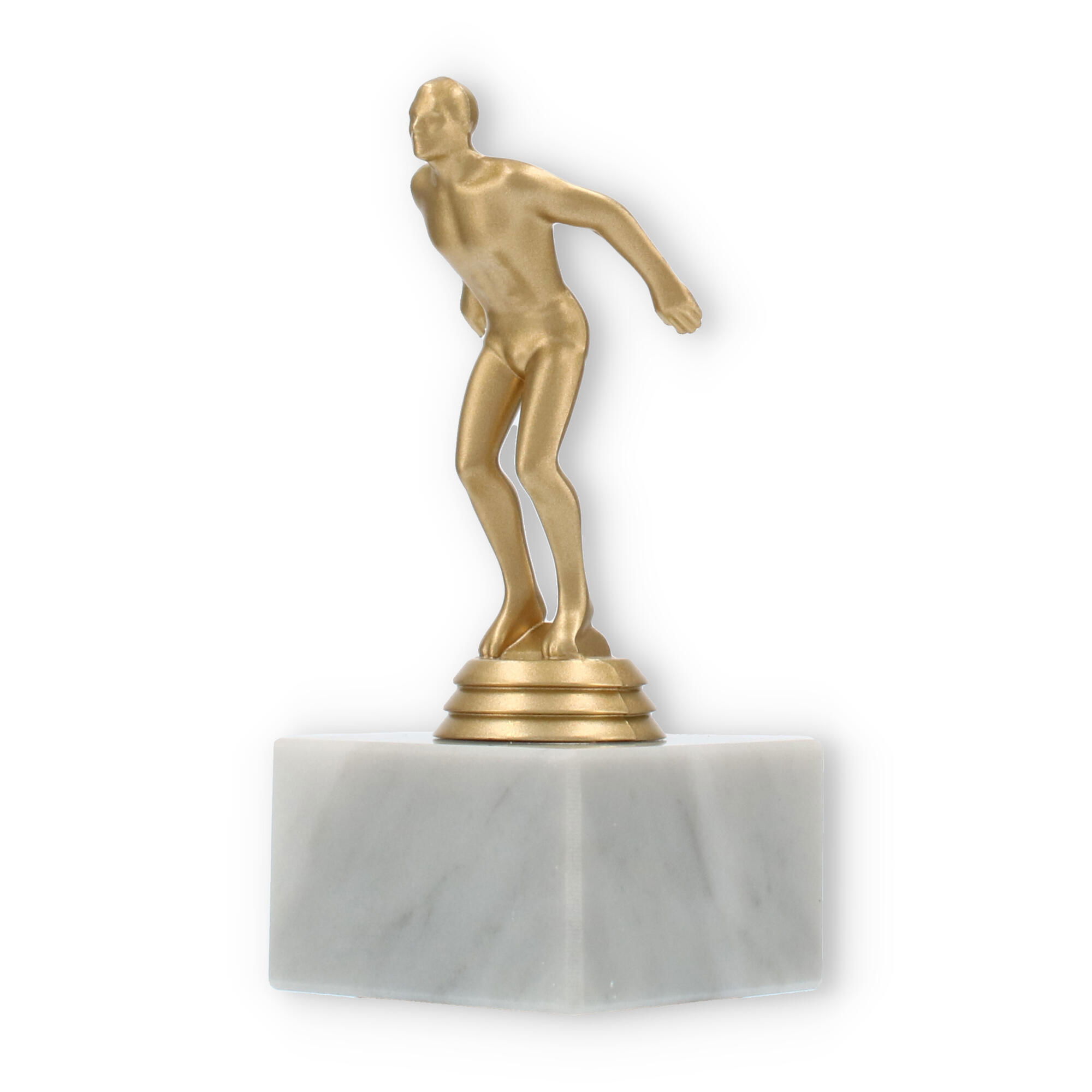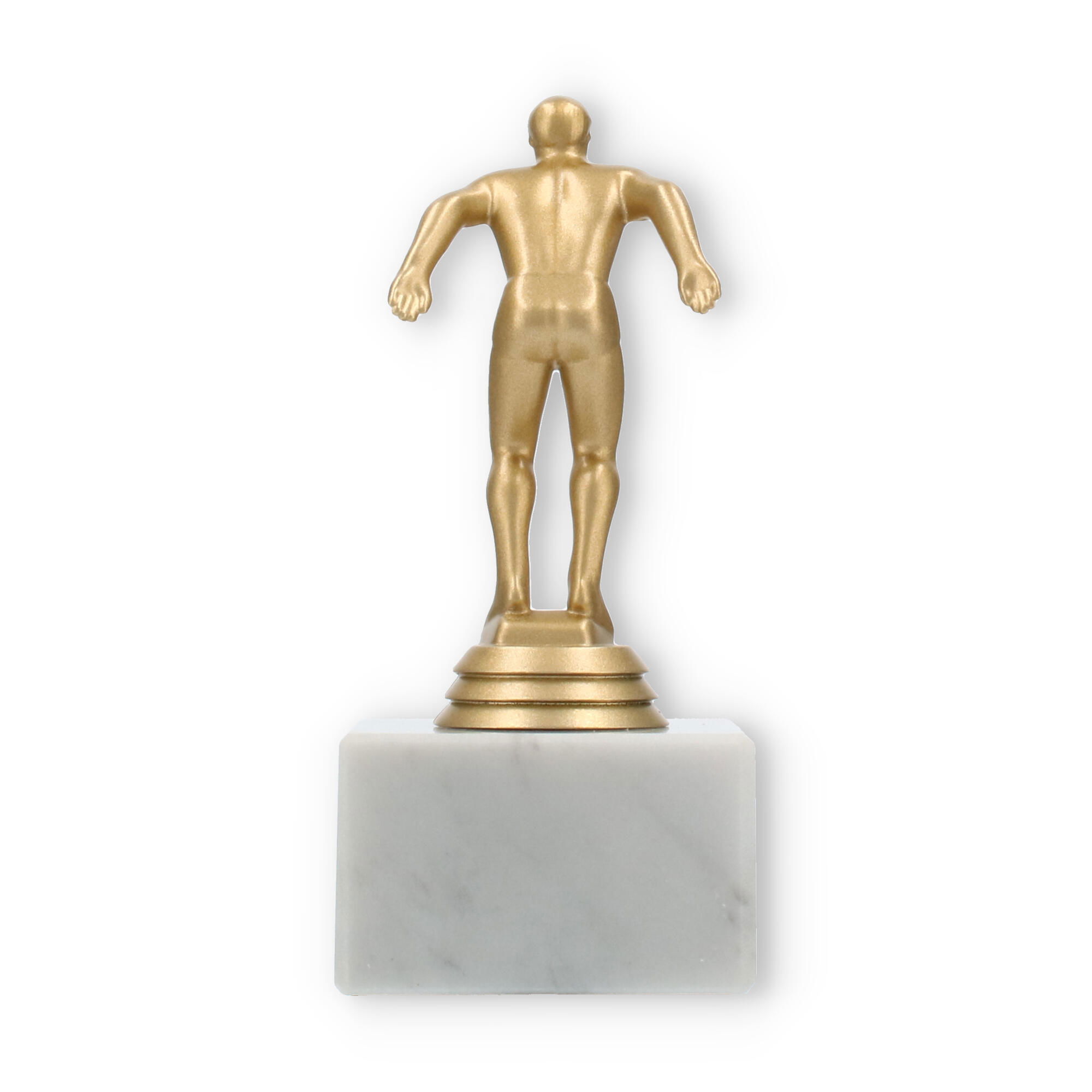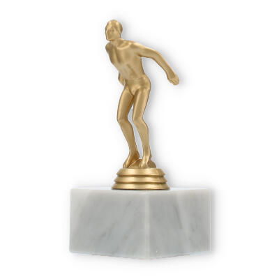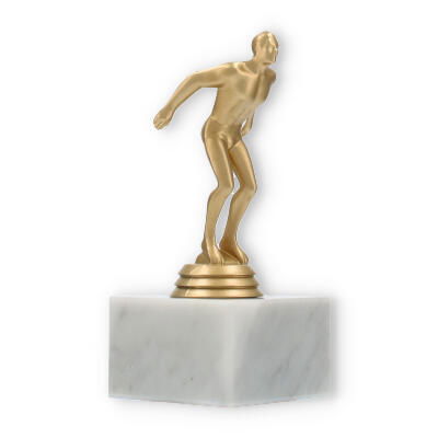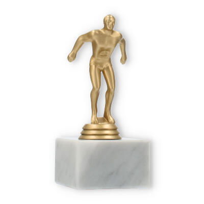 Der kubische Sockel aus weißem Marmor verleiht der Trophäe eine zusätzliche Eleganz. Mit seiner glatten und polierten Oberfläche vermittelt er eine klassische Anmutung und bietet eine stabile Basis für die goldmetallische Figur darüber.