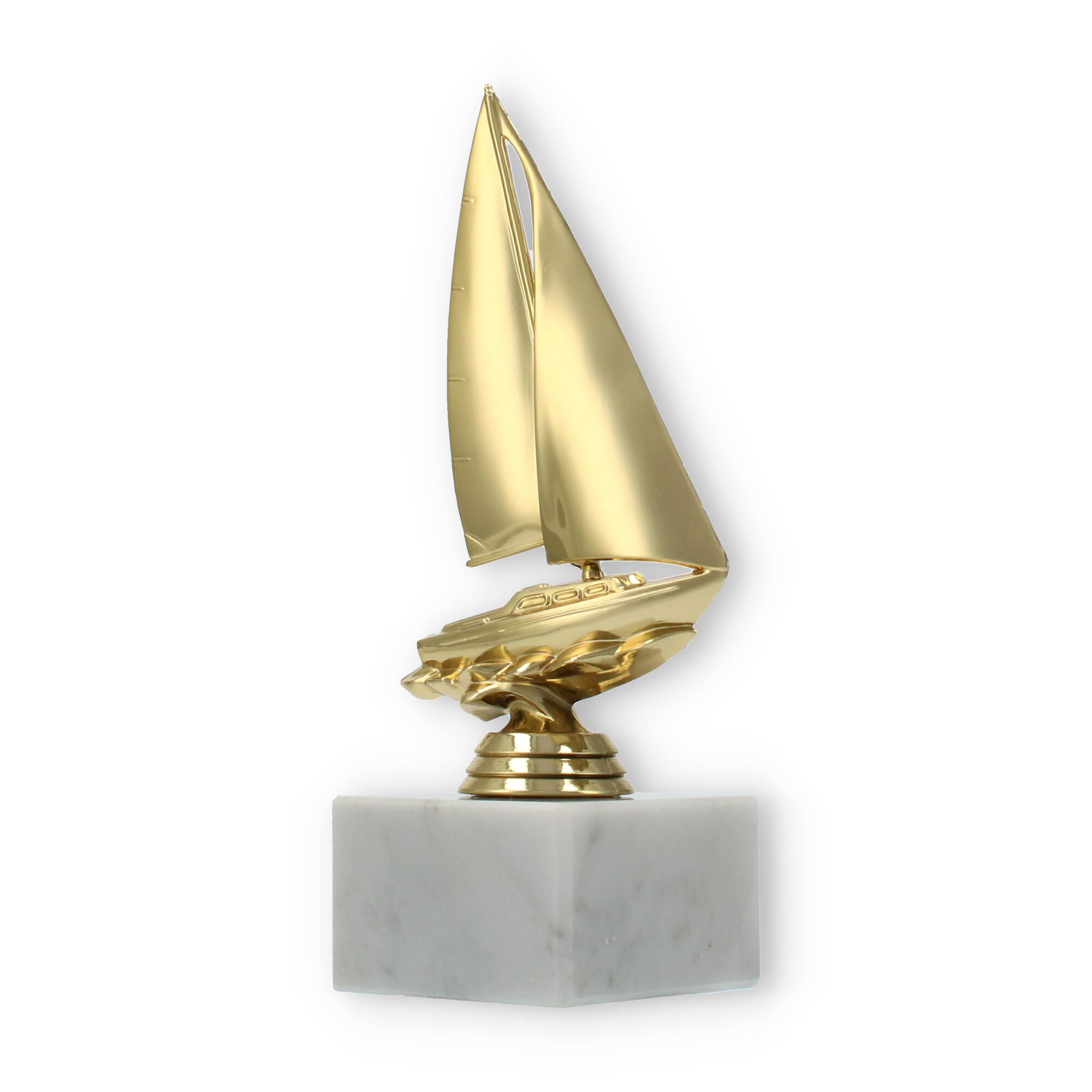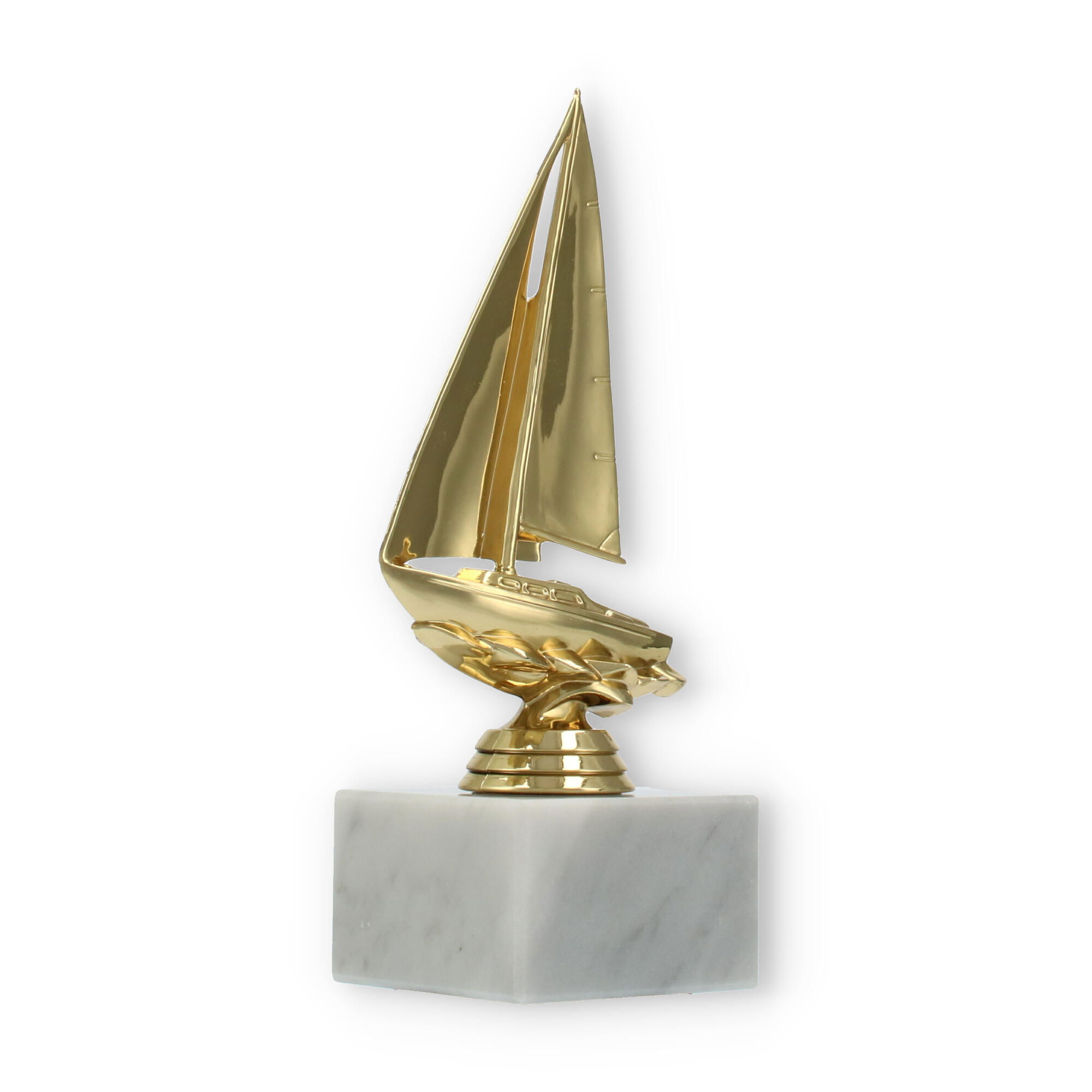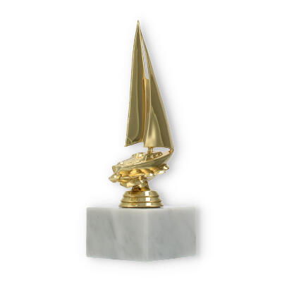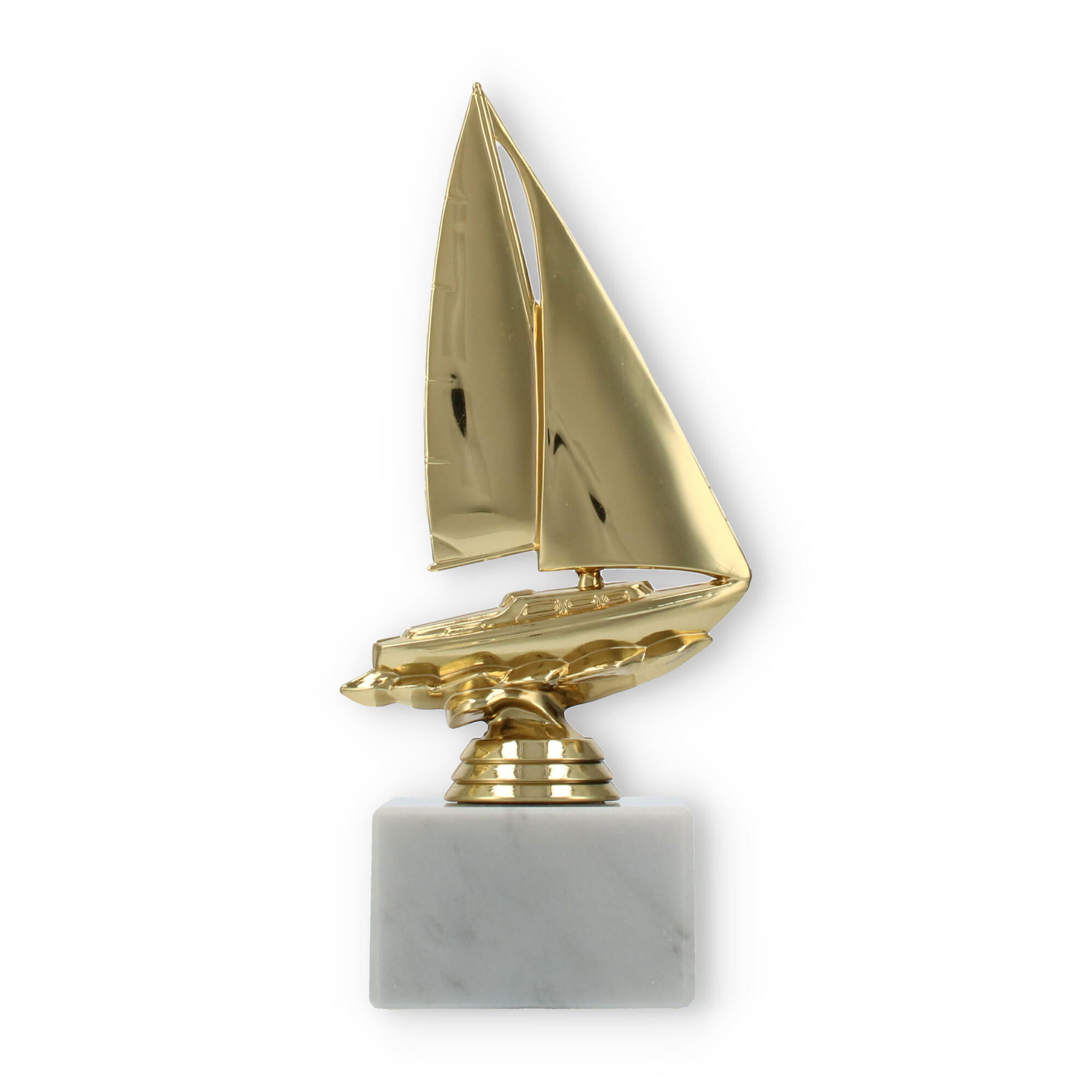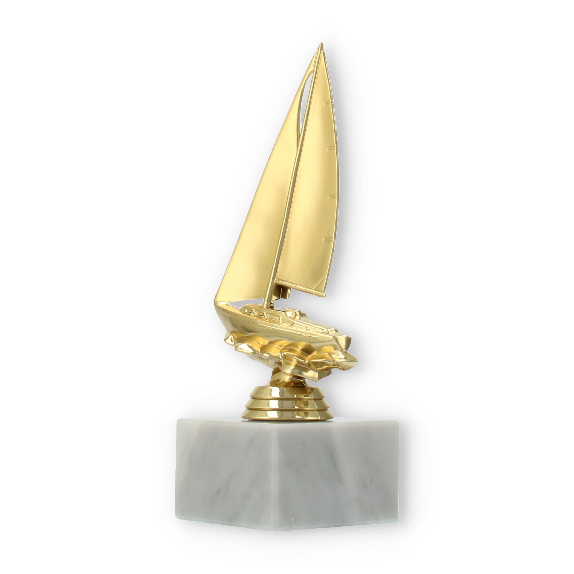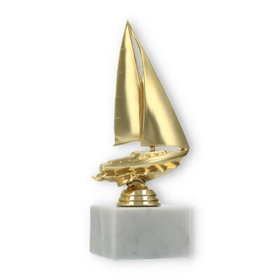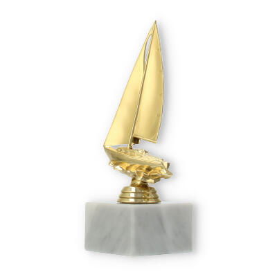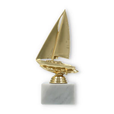 Die Pokalfigur Segelboot, goldfarben und 19 cm groß, bietet eine eindrucksvolle Ehrung für jeden Segelwettbewerb. Auf dem weißen Marmorsockel mit Gravurschild in goldfarben lässt sie sich individuell anpassen und überzeugt durch ihr einzigartiges Design und die besondere Symbolkraft.