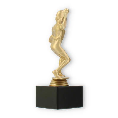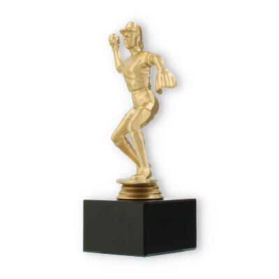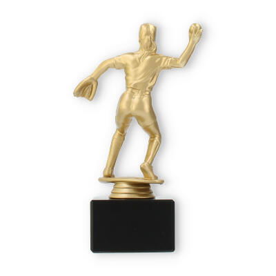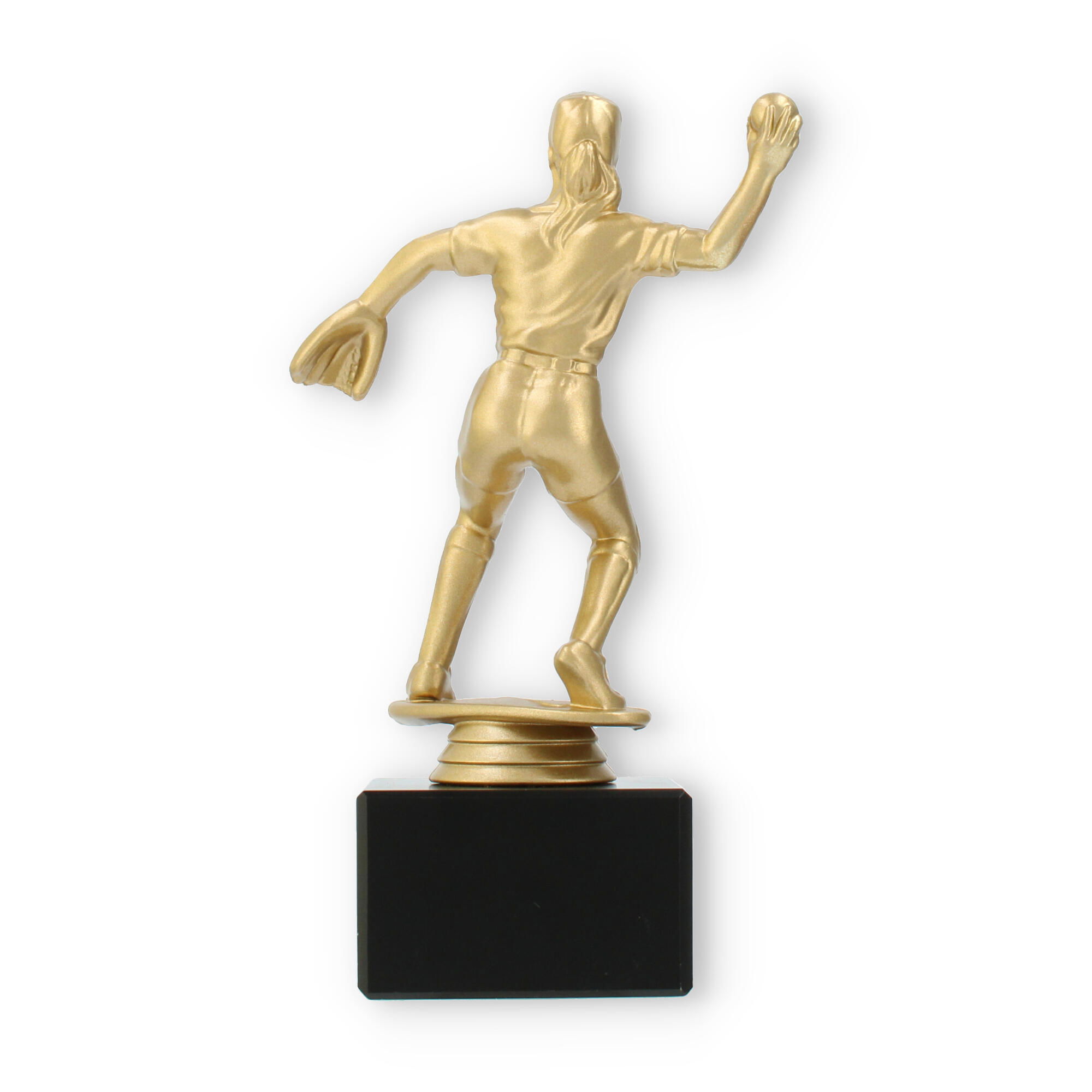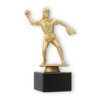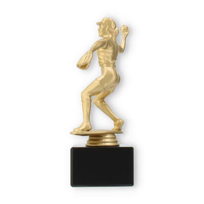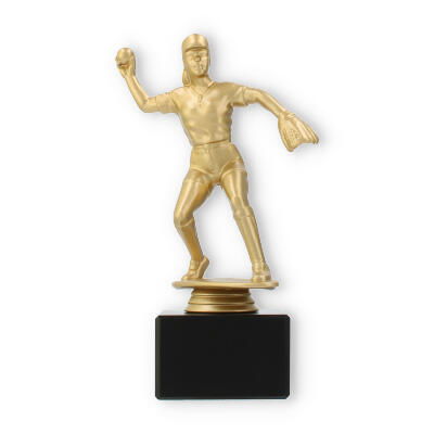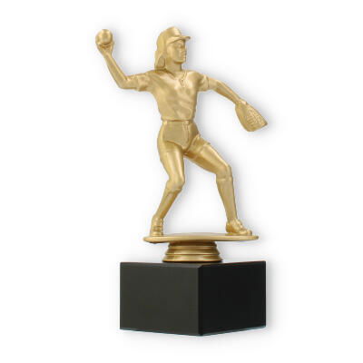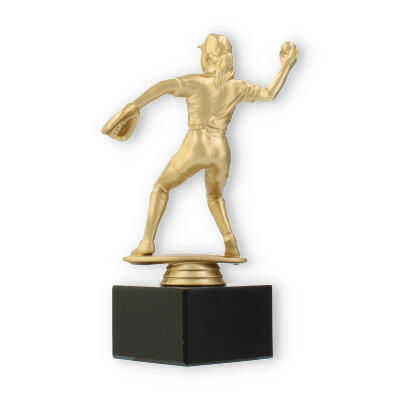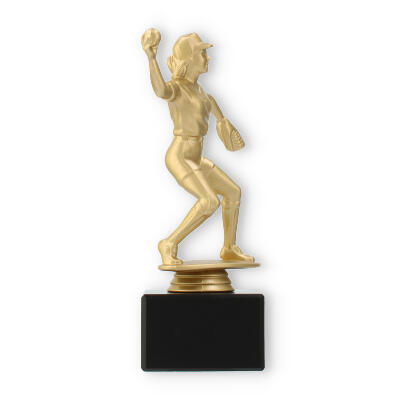 Questa coppa in plastica effetto oro metallic cattura l'essenza della vittoria in ogni suo dettaglio. La figura di un giocatore di softball in un'azione dinamica si erge sulla robusta base di marmo nero, sottolineando la maestosità del momento.