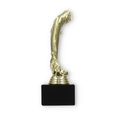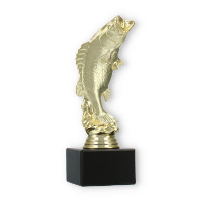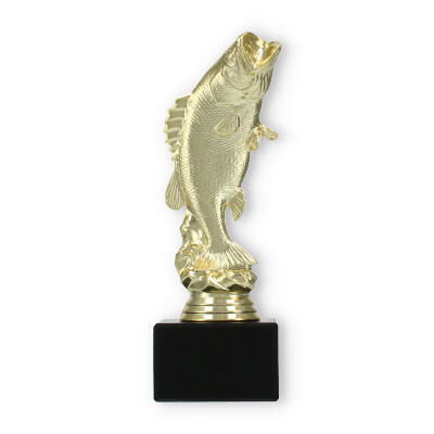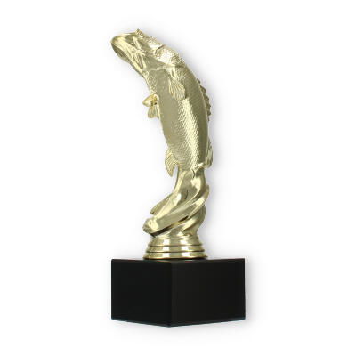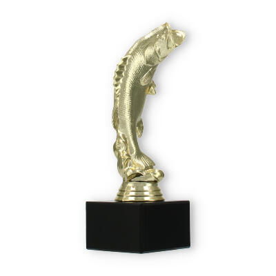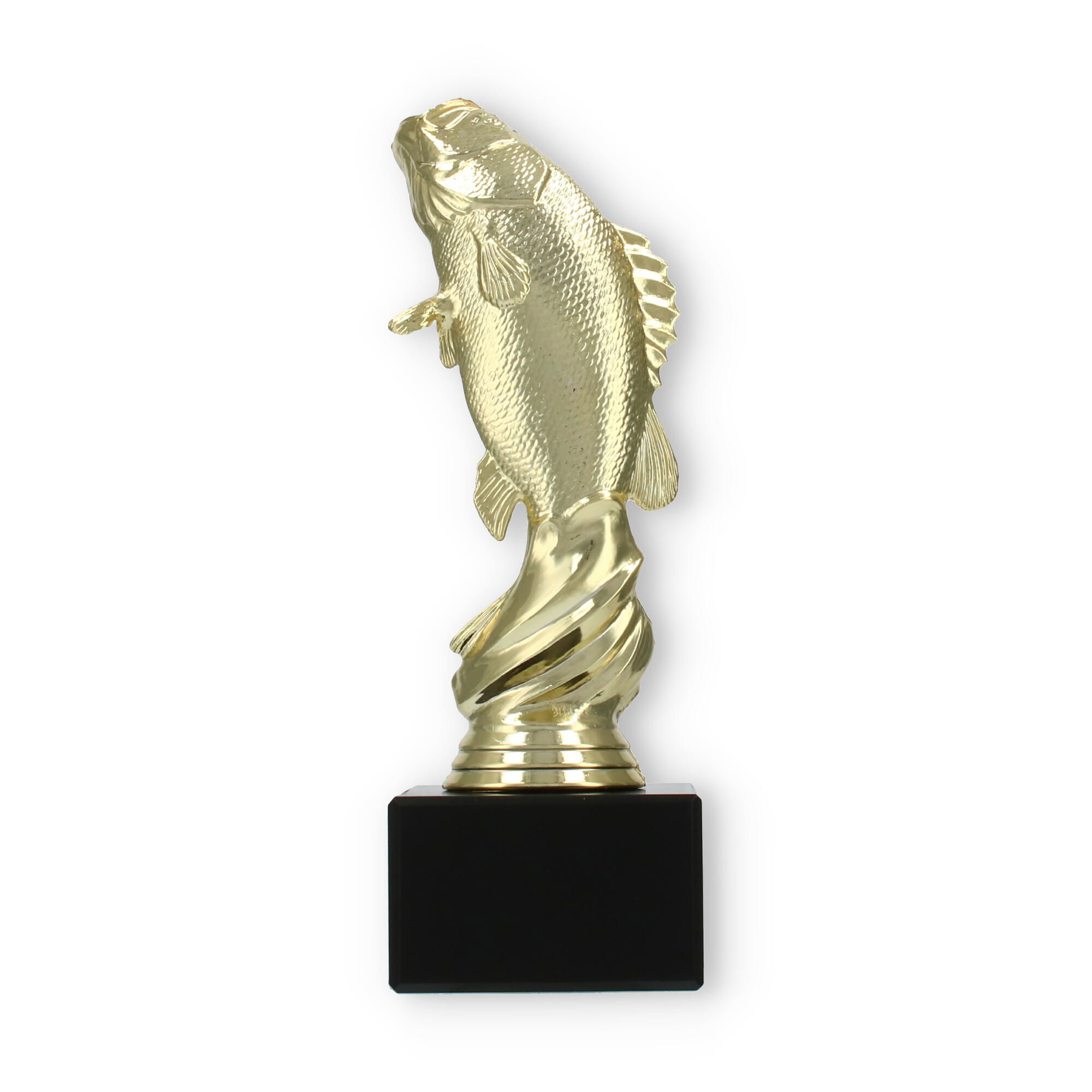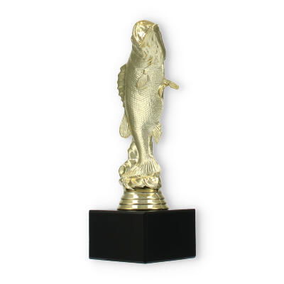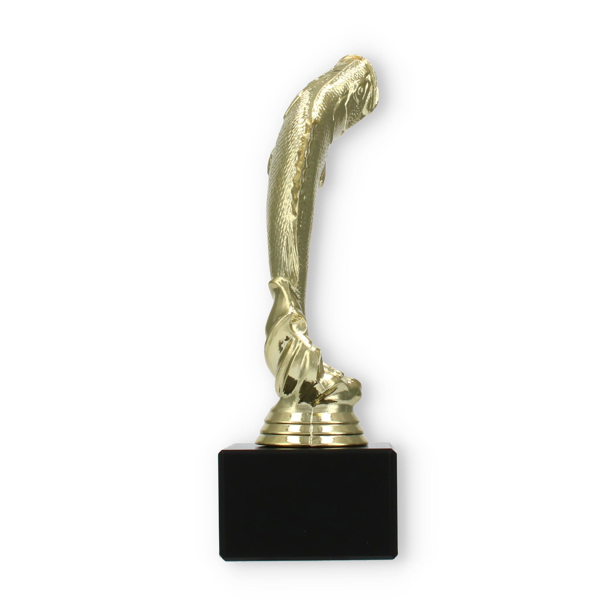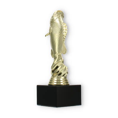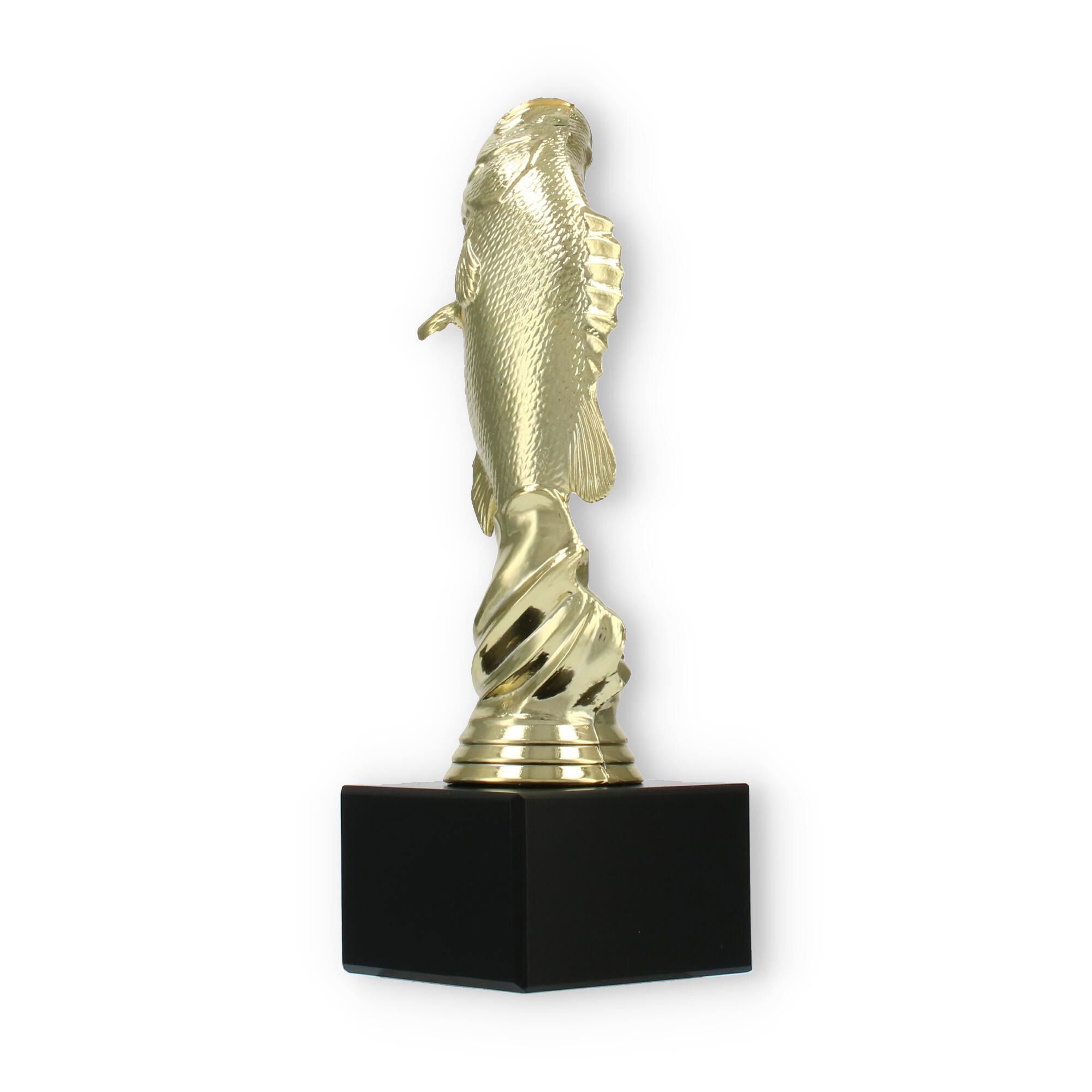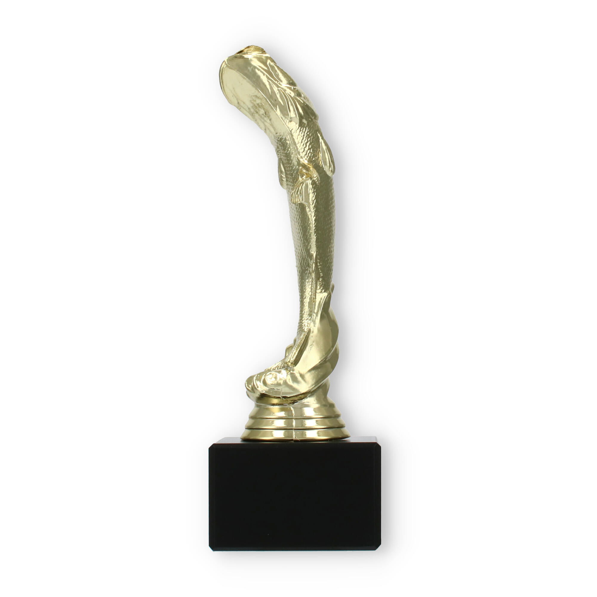 This trophy's base is made of solid black marble, providing stability and a refined look that beautifully contrasts with the gold-colored fish figure. The overall height of 19.4 cm makes this trophy prominent and substantial, perfect for making a lasting impression.