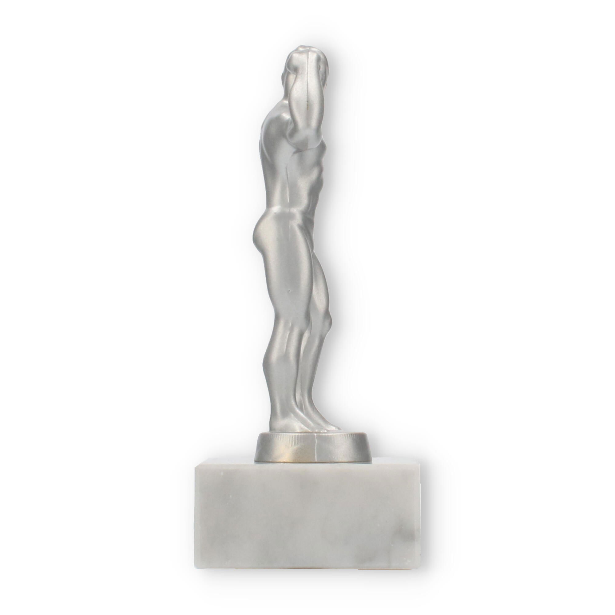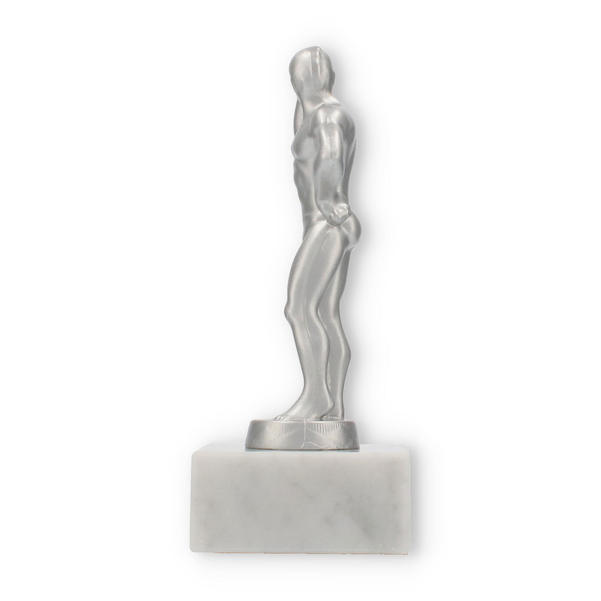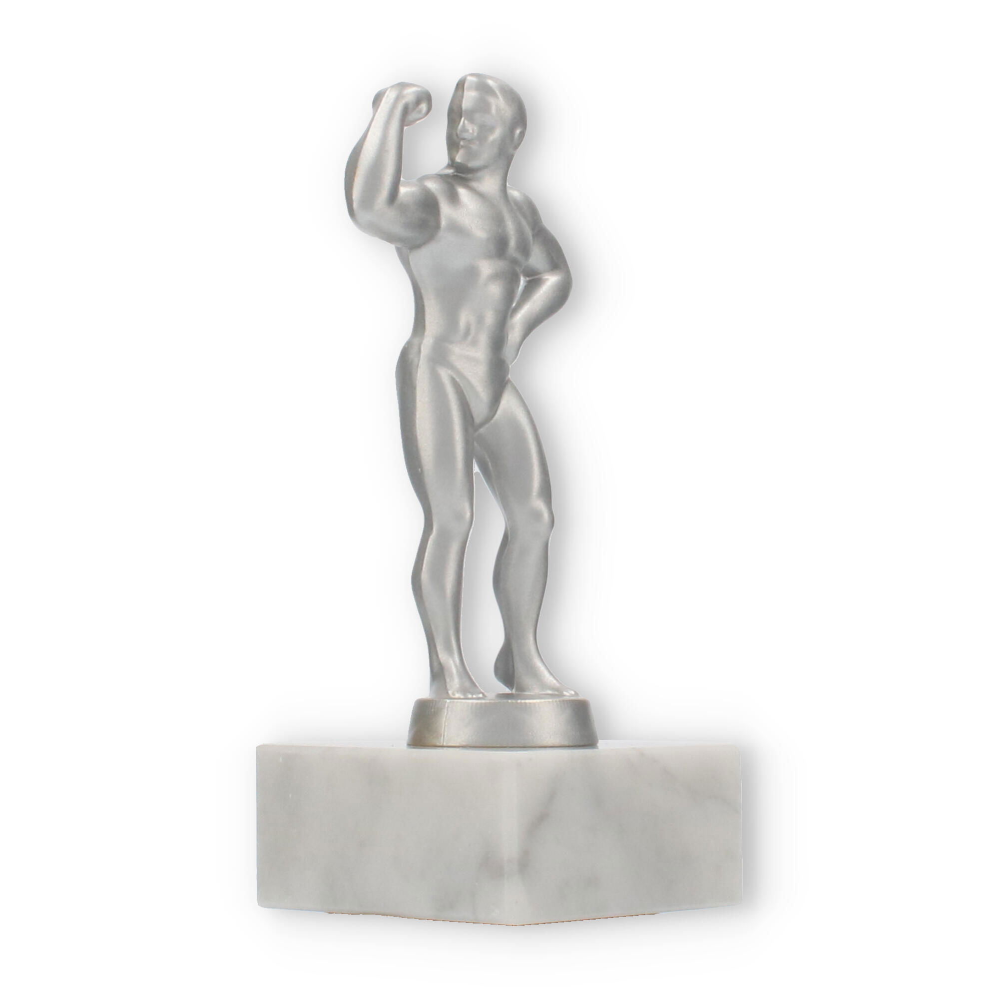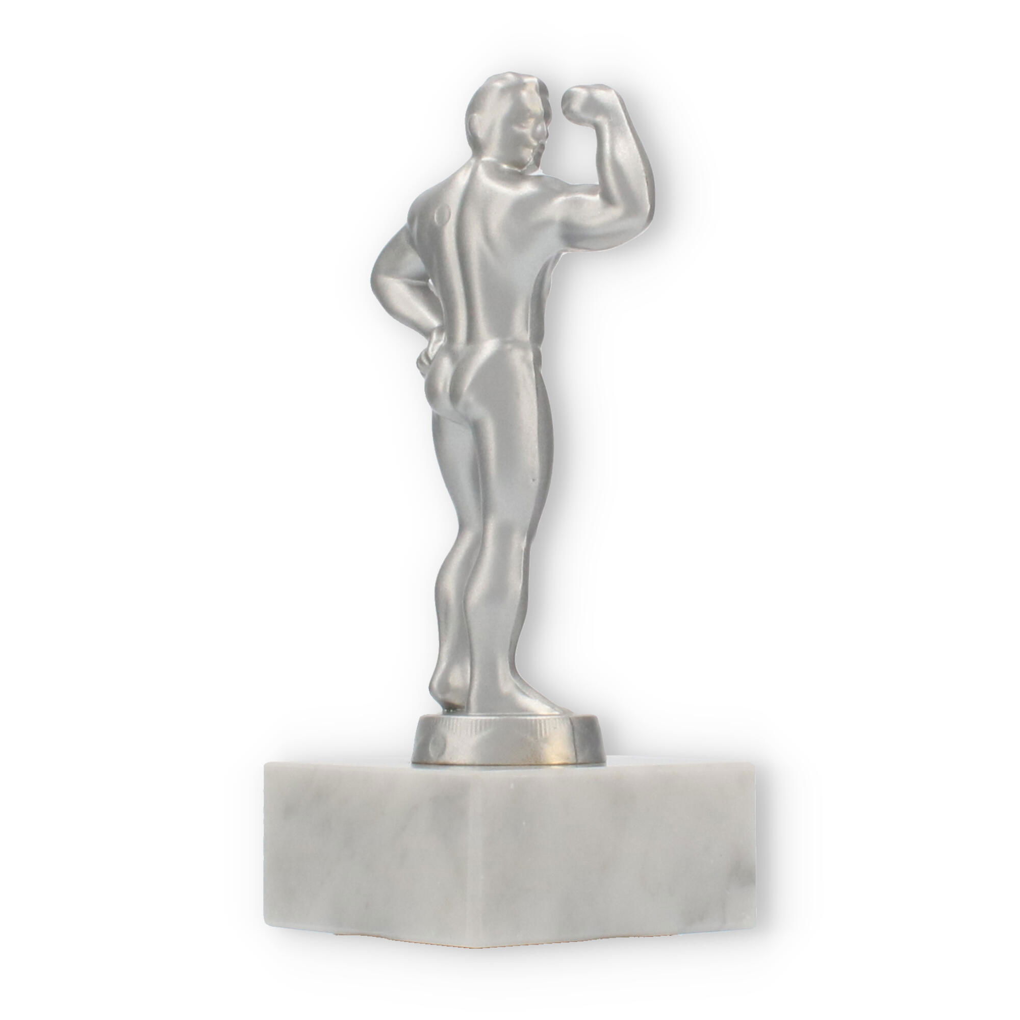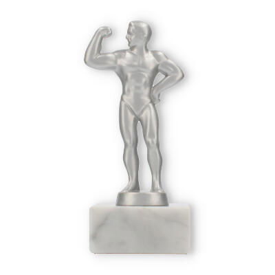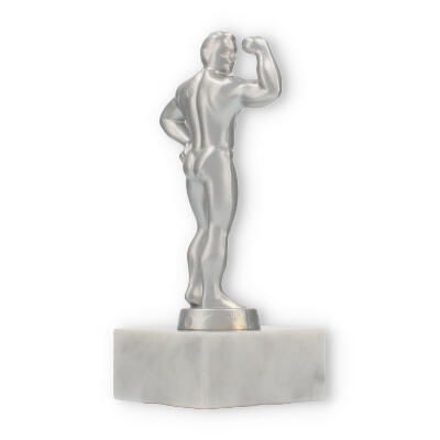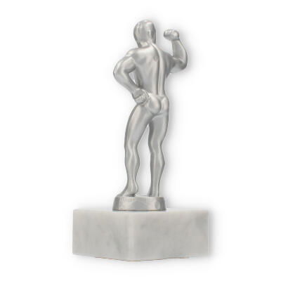 Unsere Pokalfigur Bodybuilder verleiht jeder Auszeichnung eine besondere Note. Sie zeigt einen muskulösen Mann in einer Pose, die Stärke und Selbstbewusstsein ausdrückt. Die metallene Figur im silbermetallic-Look steht auf einem eleganten Marmorsockel, der durch seine weiße Farbe und natürliche Maserung besticht.