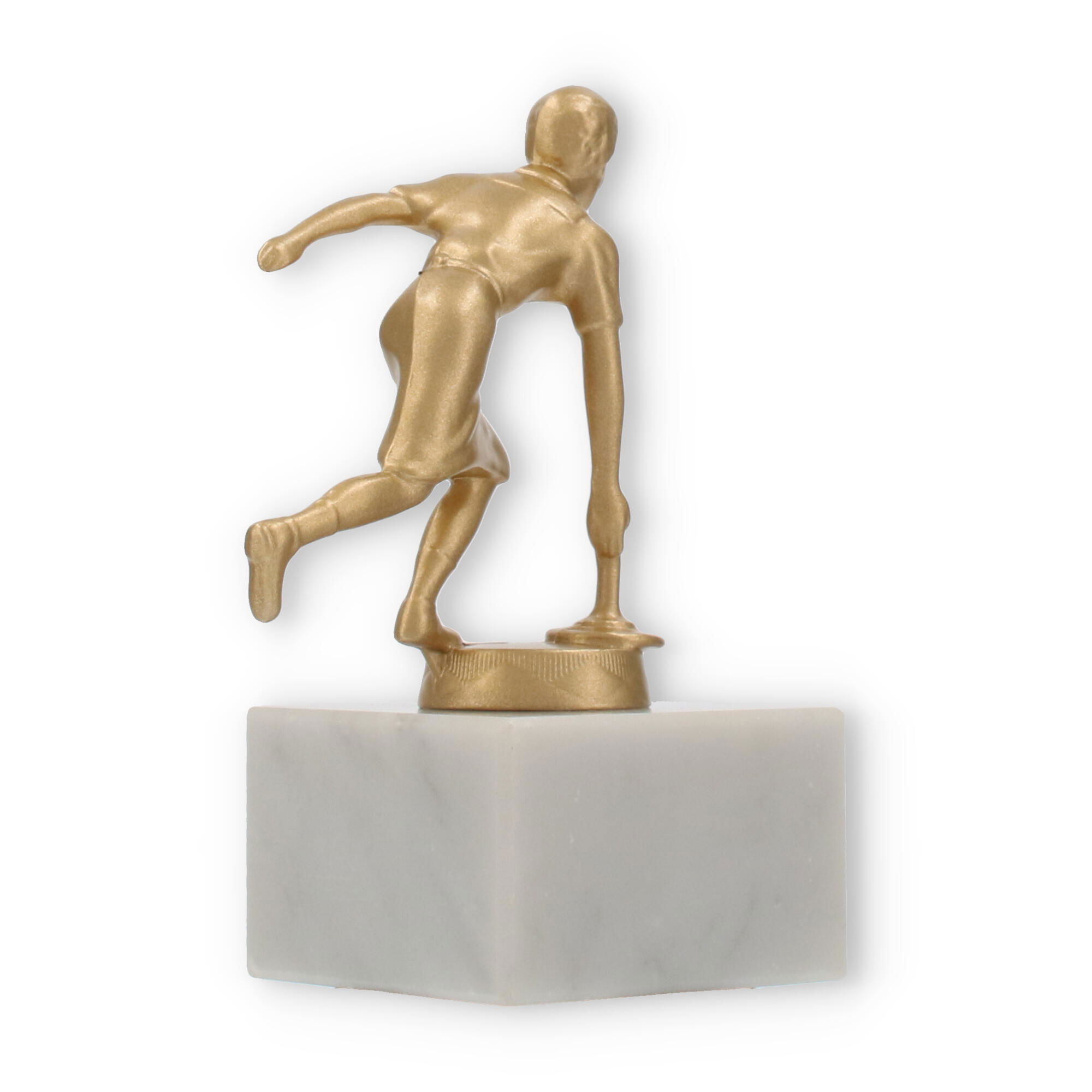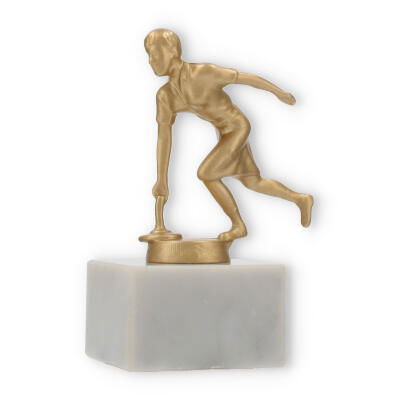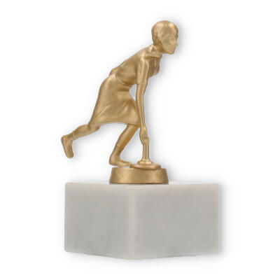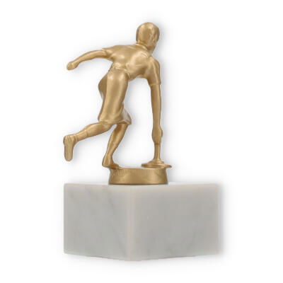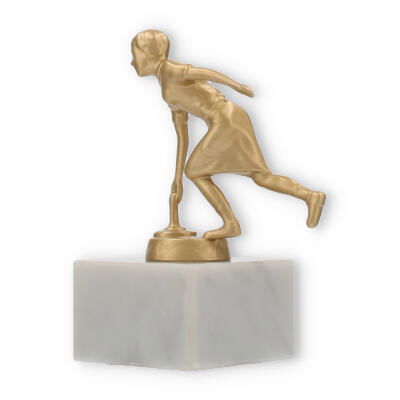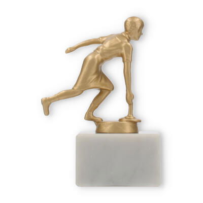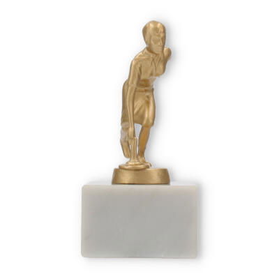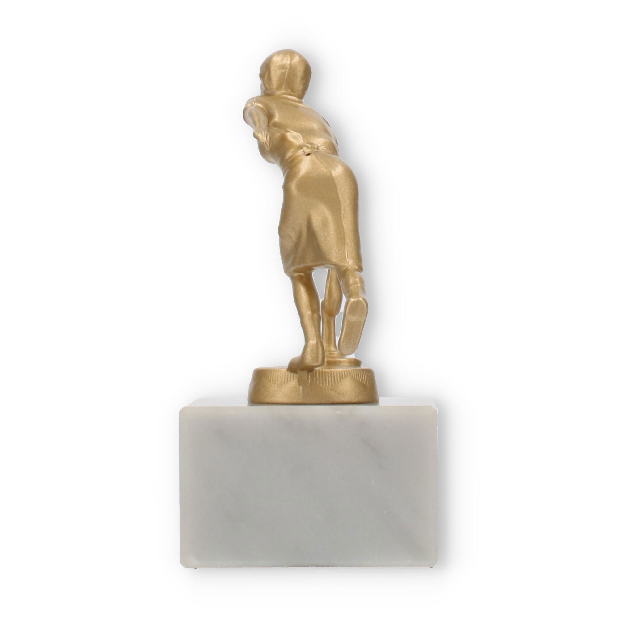 Deze trofee kenmerkt zich door een stijlvolle gouden metalen figurine bovenop een solide witte marmeren voet. Met gravureopties creëert u een unieke herinnering, ideaal voor sportieve successen.
