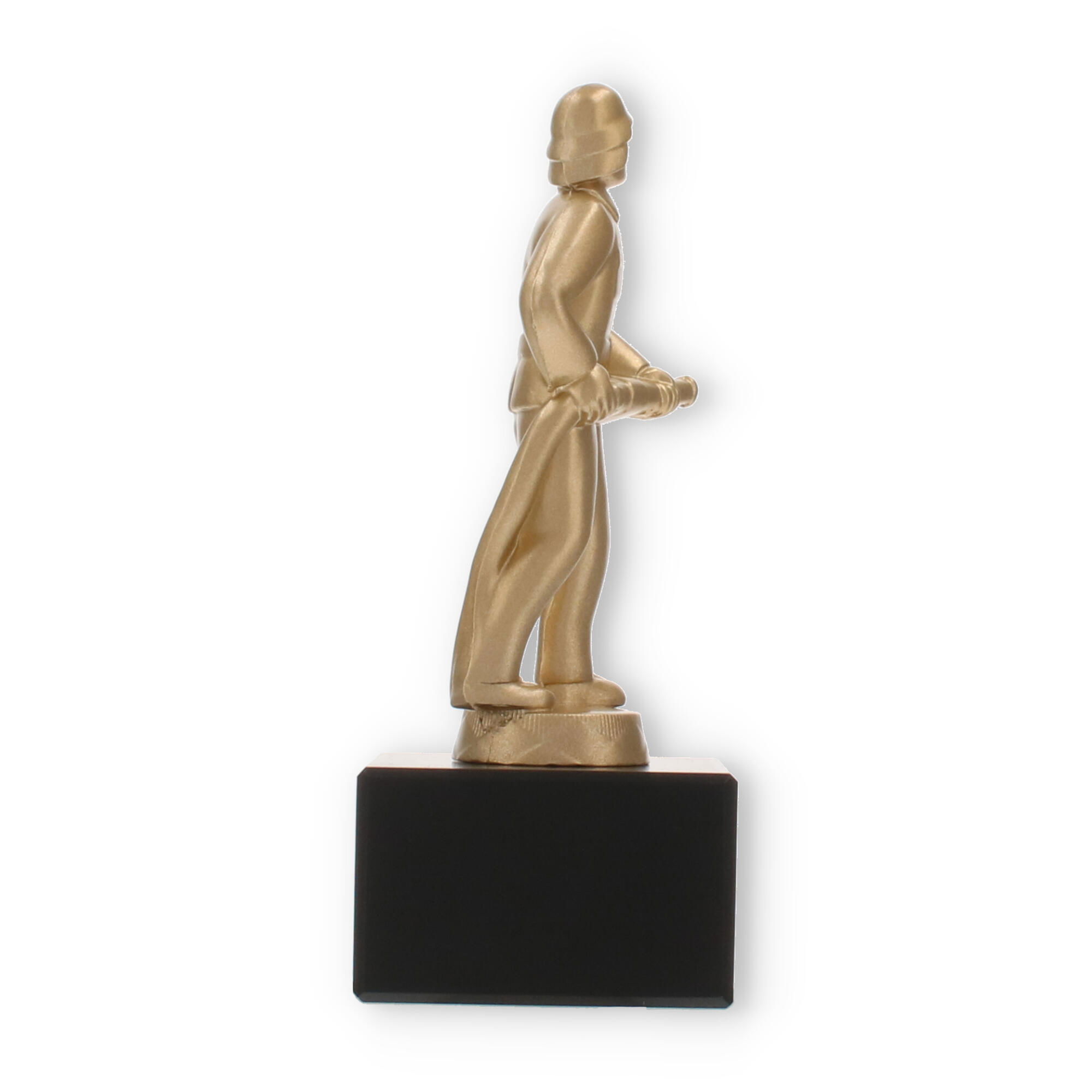 Die Figur des Pokals stellt einen tapferen Feuerwehrmann dar, vergoldet und in einer heroischen Pose. Er hält ein Feuerwehrschlauchmundstück, was seine Einsatzbereitschaft und Tatkraft symbolisiert. Der goldfarbene Mannschaftshelm und die detaillierte Uniform machen diesen Pokal zu etwas ganz Besonderem.