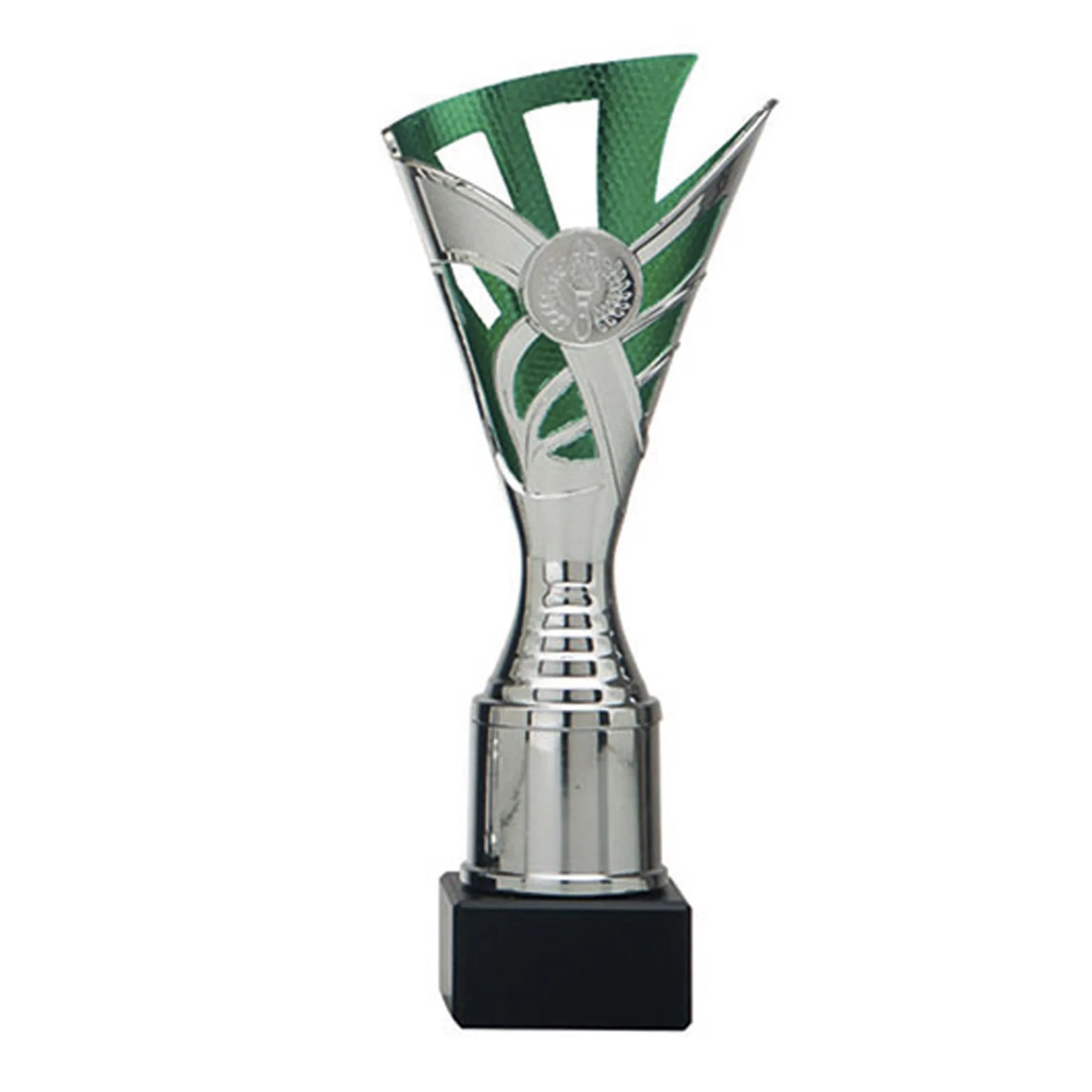 Las Copas Diemo se presentan como el premio ideal para aquellos eventos donde el diseño y la personalización son esenciales. Con su elegante estructura cónica en combinación de tonos plateado y verde, estos trofeos marcan la diferencia al momento de ser entregados. Los elementos curvados y superpuestos del cuerpo crean un atractivo visual que evoca formas florales, aportando sofisticación al conjunto.