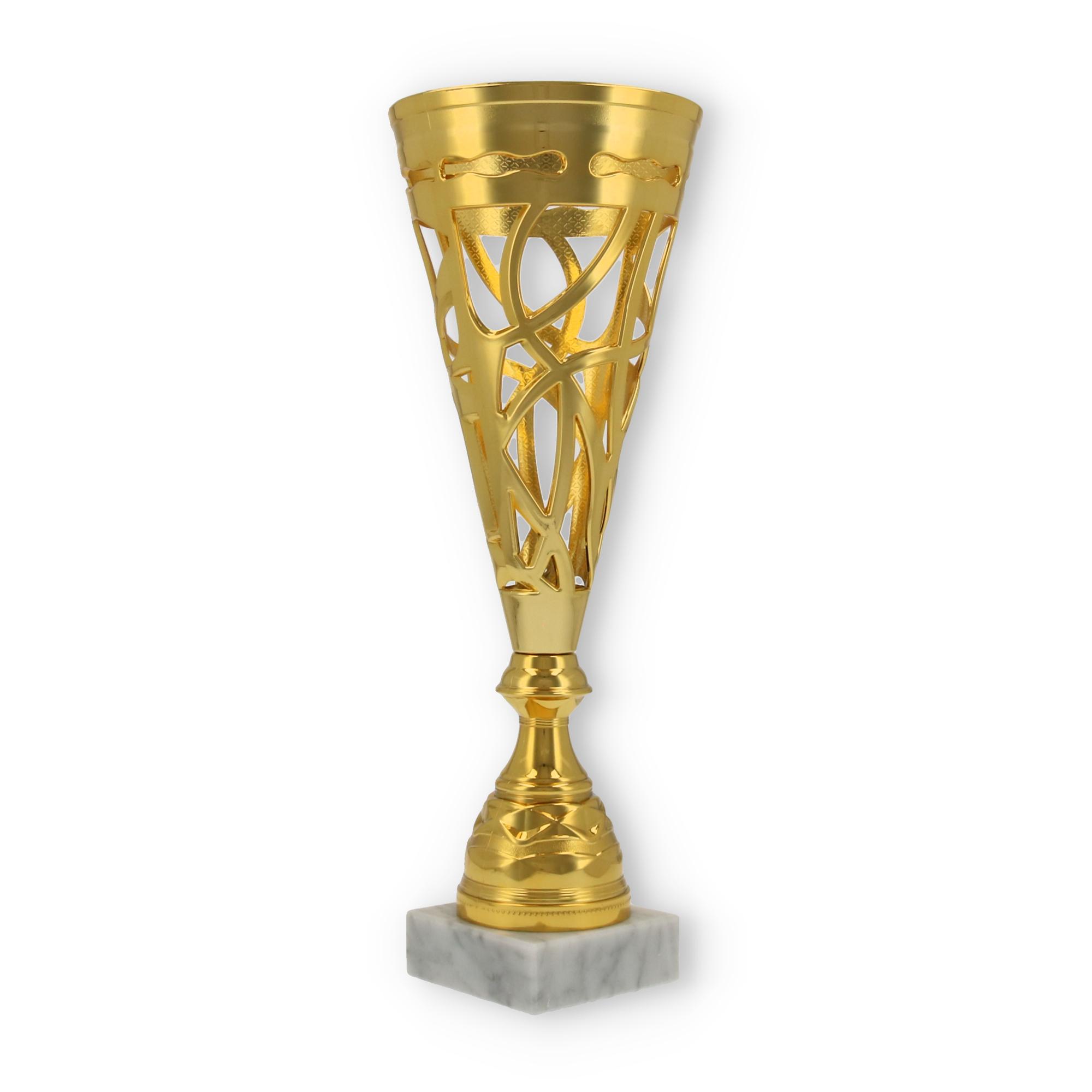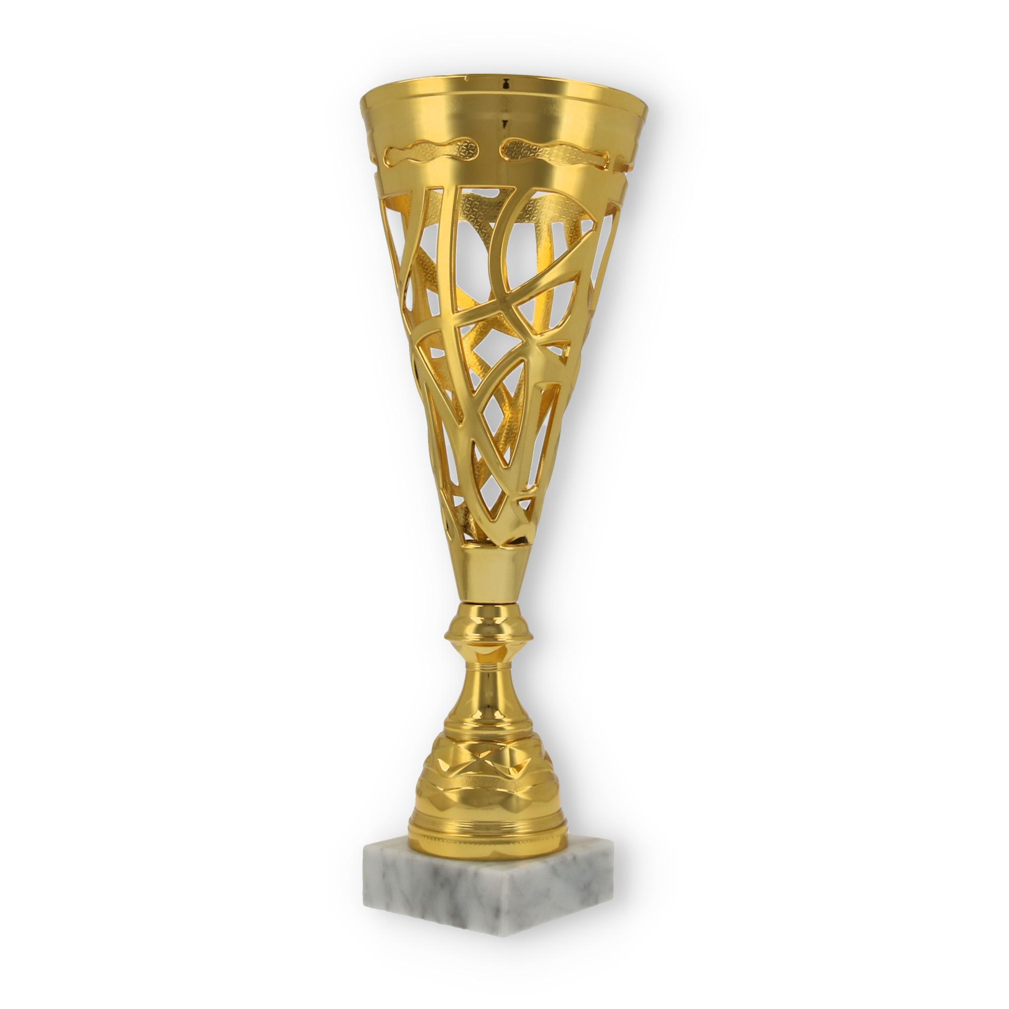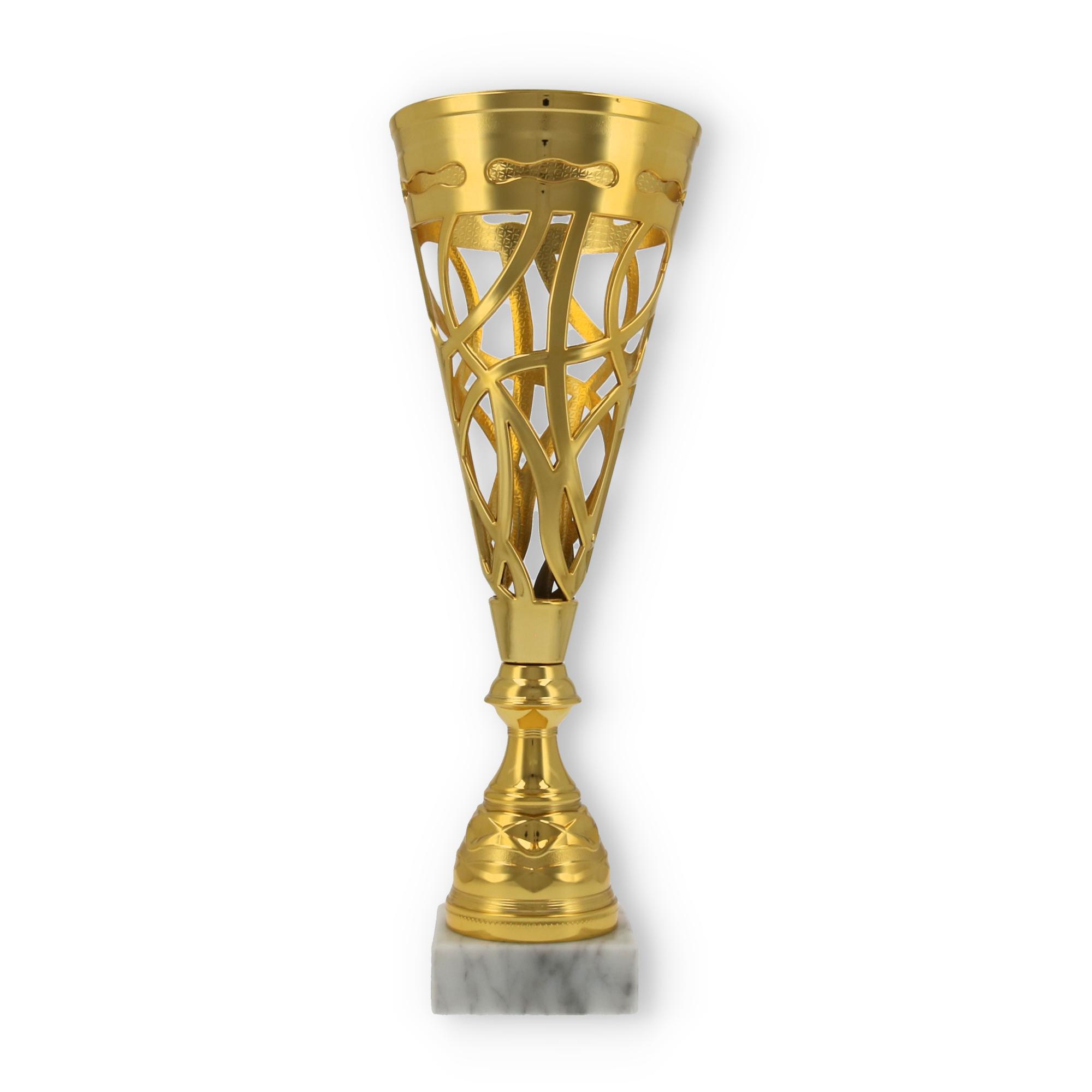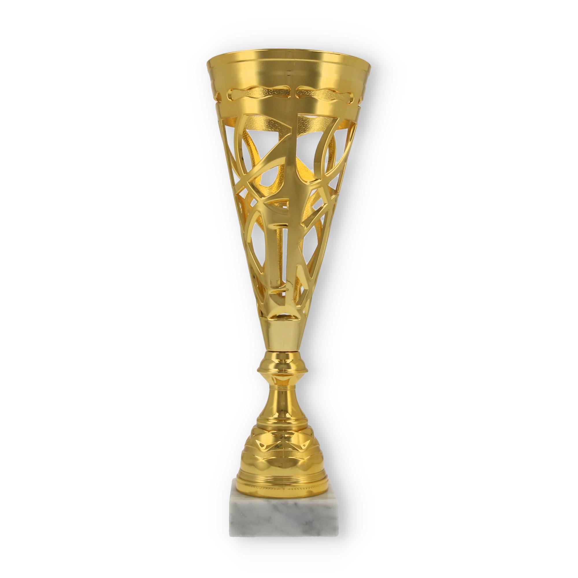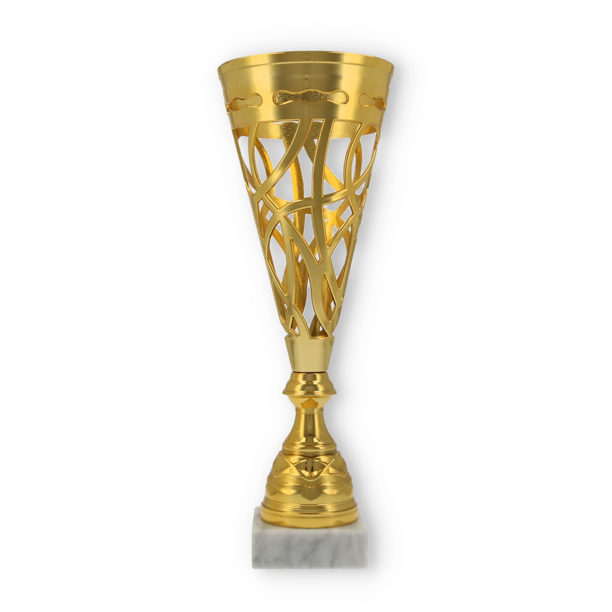 Unterstützt wird diese Wirkung durch den stabilen Sockel aus marmoriertem Material. Er verleiht dem Pokal nicht nur Stabilität, sondern auch eine gewisse Eleganz, die jede Zeremonie bereichert.