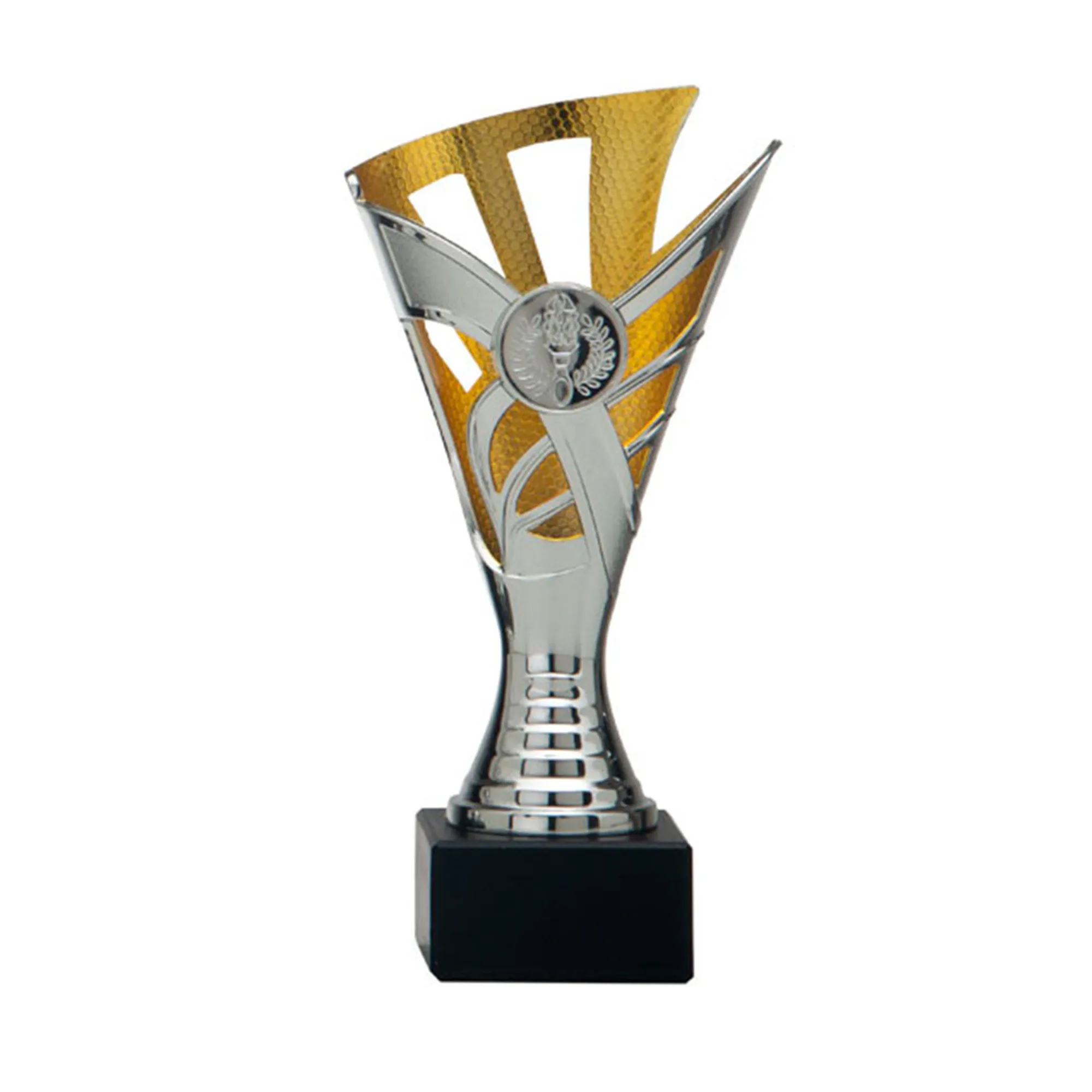 Der Pokal Emre beeindruckt mit einem Design, das Eleganz und Dynamik vereint. Die geschwungenen Linien und das offene Design schaffen eine faszinierende Optik. Dabei ist der Einsatz von silberfarbenem Metall und die goldfarbene Wabenstruktur im Inneren ein echter Hingucker bei jeder Zeremonie.
