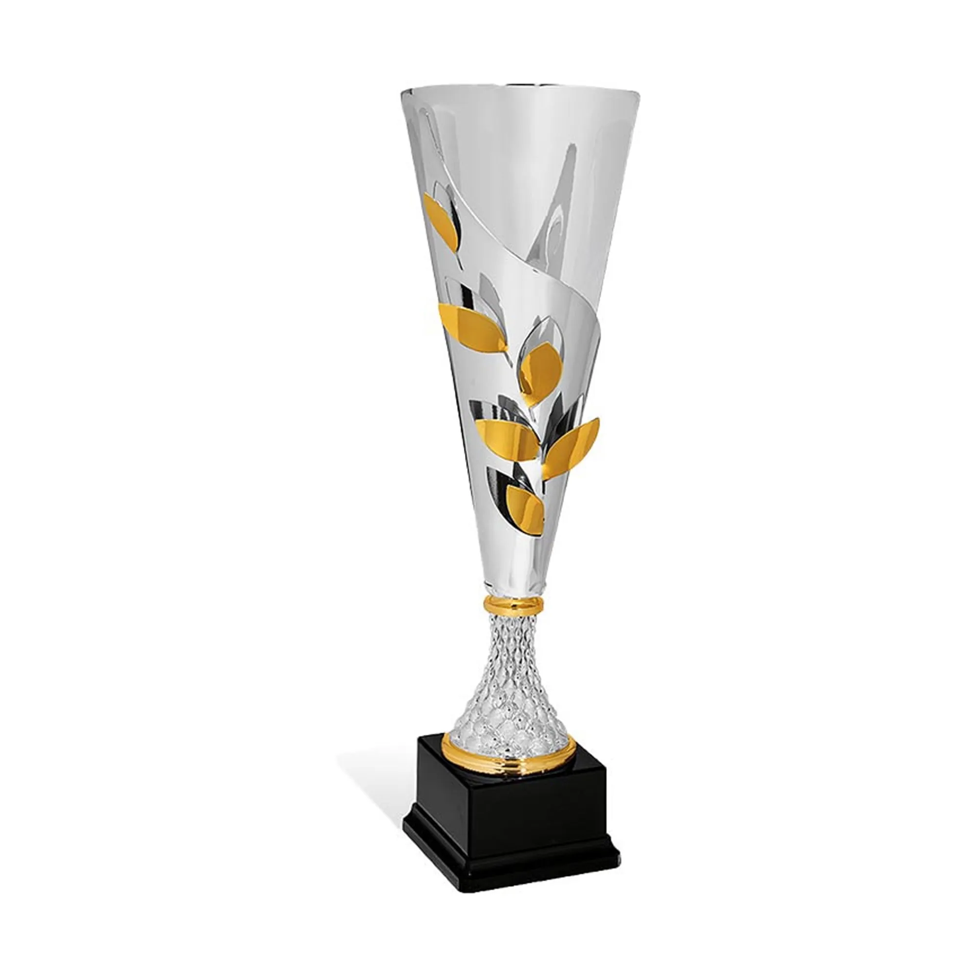 Der Pokal präsentiert sich mit einem auffälligen, konischen Kelch, dessen silberfarbene Oberfläche durch goldfarbene, florale Elemente verziert wird. Diese Kombination aus Farben verleiht dem Pokal eine luxuriöse Optik, die jeden Ehrungsmoment besonders macht.