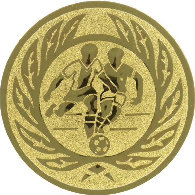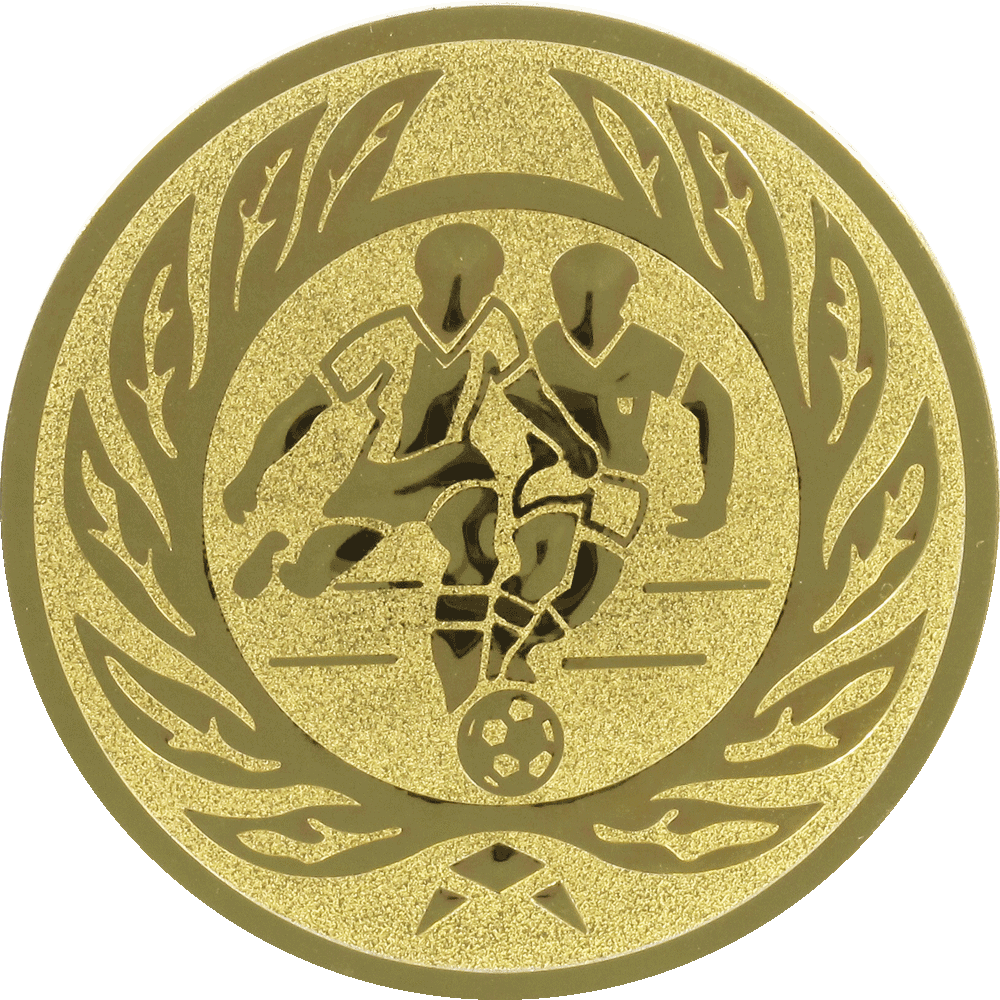 O emblema de alumínio dourado em relevo com 50 mm é ideal para homenagear atletas em cerimônias esportivas. Com um desenho detalhado de jogadores de futebol e uma elegante coroa de louros, ele simboliza o triunfo em campo.