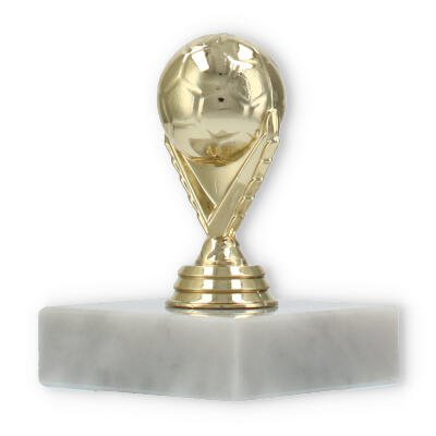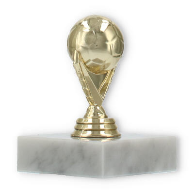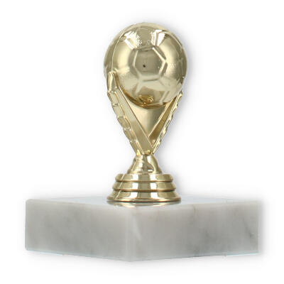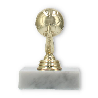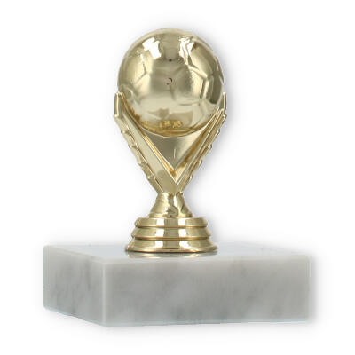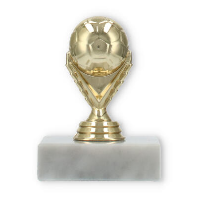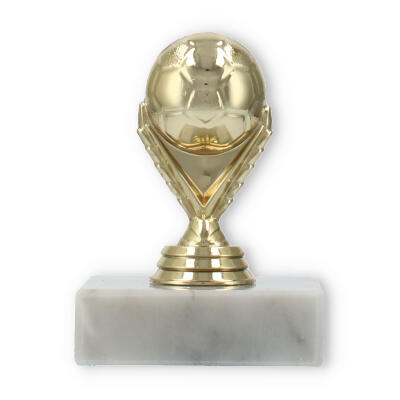 Com uma figura em plástico dourado detalhadamente esculpida, a peça é sustentada por uma base de mármore branco que garante estabilidade e elegância. Cada detalhe é projetado para captar a essência do futebol, com características que exaltam o entusiasmo e a paixão deste desporto.